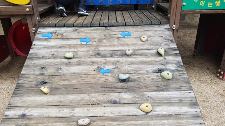 작업 방법: 기존구멍에 고정용 목재 너트와 앙카 볼트를 클라이밍 홀드에 채결해서 움직이지 않도록 육각