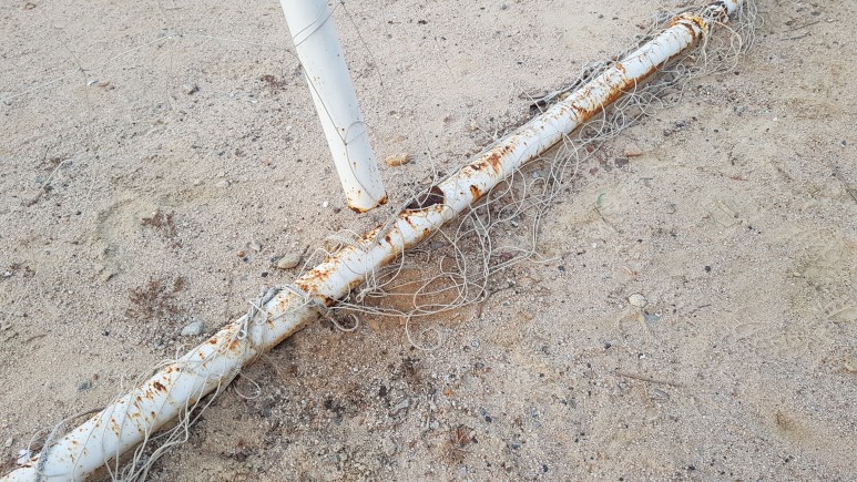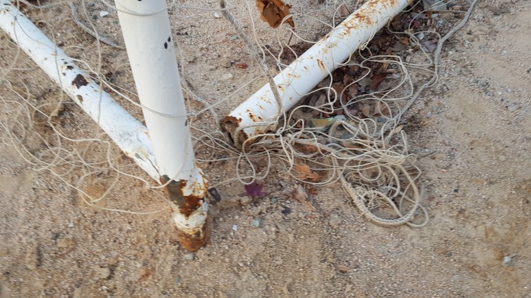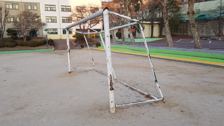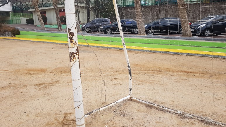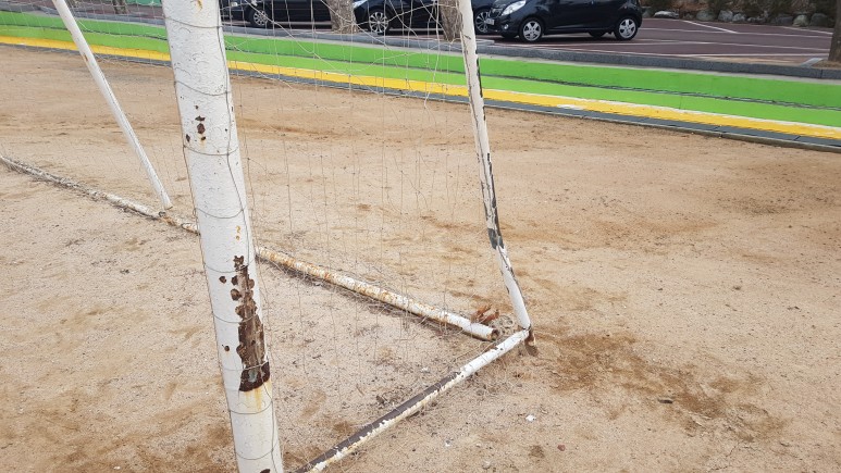 작업 진행: 기존에 있던 축구 골네트를 철거해줍니다. 페인트 작업 후 골대 네트를 골대에 씌워서 축구
