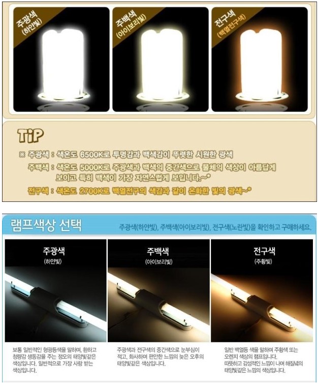 보통 램프 색상은 주광색[하얀빛] 과 전구색[노란빛] 등의 색상이 많이 사용됩니다.