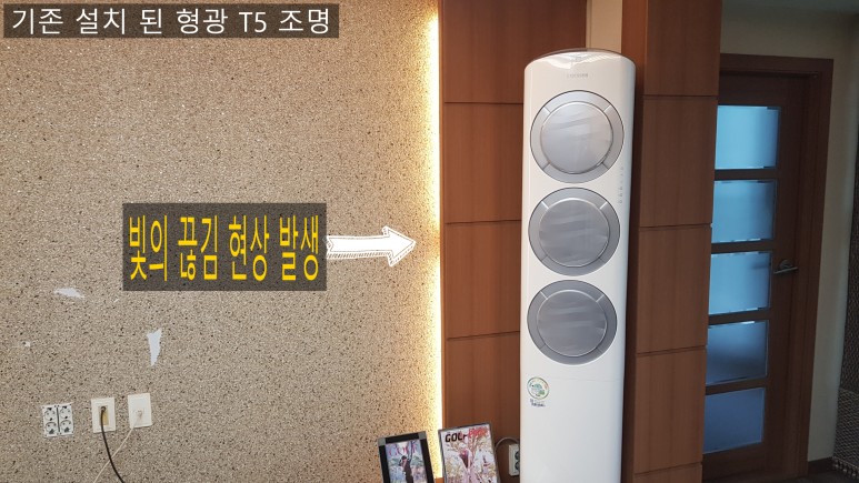 기존 설치되었던 형광 T5조명 입니다. 벽체 길이에 맞추지 않고 조명 사이즈에 맞추다 보니 빛의 끊김 현상이 발생하였습니다.