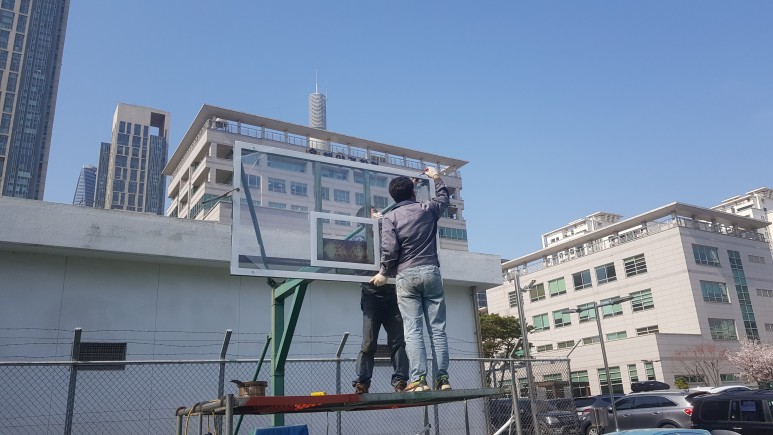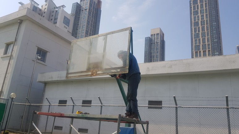 백보드를 철거한 후에 새롭게 제작된 백보드와 기존에 있는 볼트 구멍에 맞게 타공 작업을 진행합니다.
