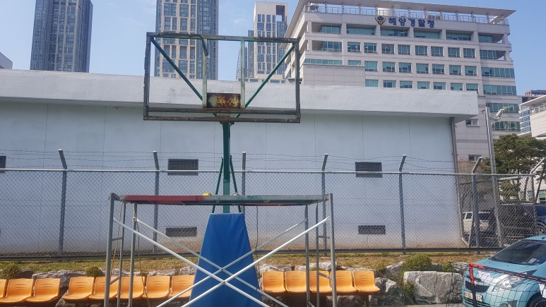 기존에 손상되었던 백보드를 철거해 줍니다. 기존 볼트의 녹 및 마모로 인해 잘 풀리지 않게 되면 그라인더를 이용하여 뒷면을 절단해 줍니다.