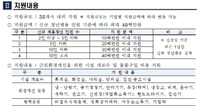 인천 소재 중소, 중견 제조기업의 근로환경 개선을 통한 기업의 인식 변화 및 일하고 싶은 직장 환경 조성으로 청년채용 독려 및 청년 일자치 창출을 위한 지원 사업입니다. 청년을 신규채용한 기업에게 근로환경개선을 위한 시설 개보수 및 물품 구입 비용 지원하는 사업을 통해 진행되었습니다.