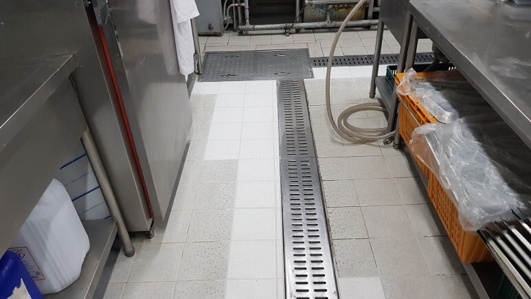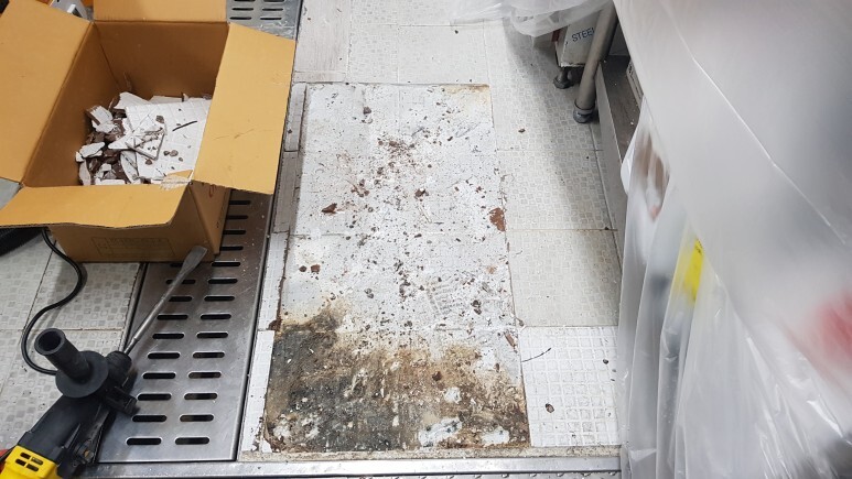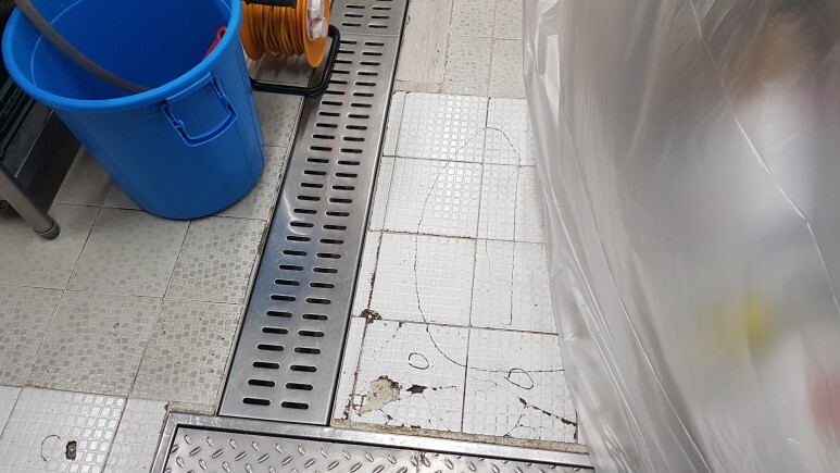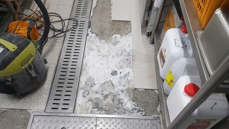 인천 계양구에 위치한 물류센터 구내식당 조리실 깨진 바닥 타일 부분 타일 교체
