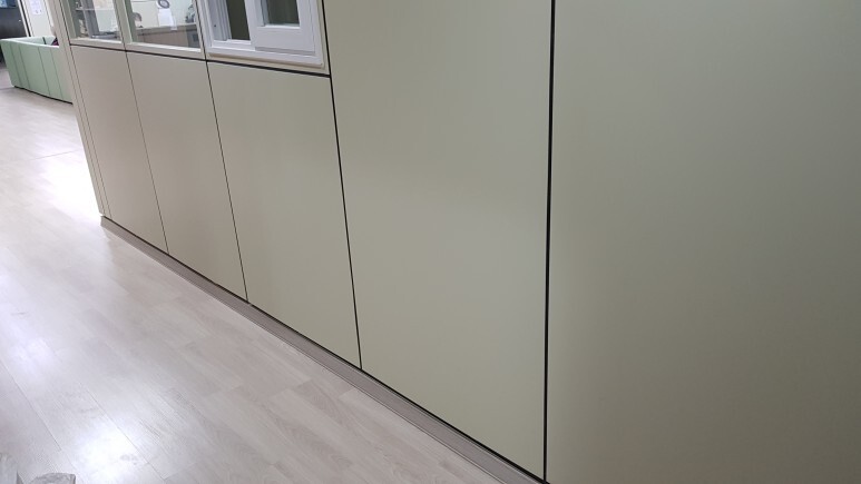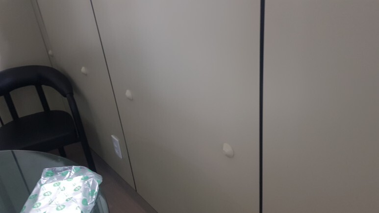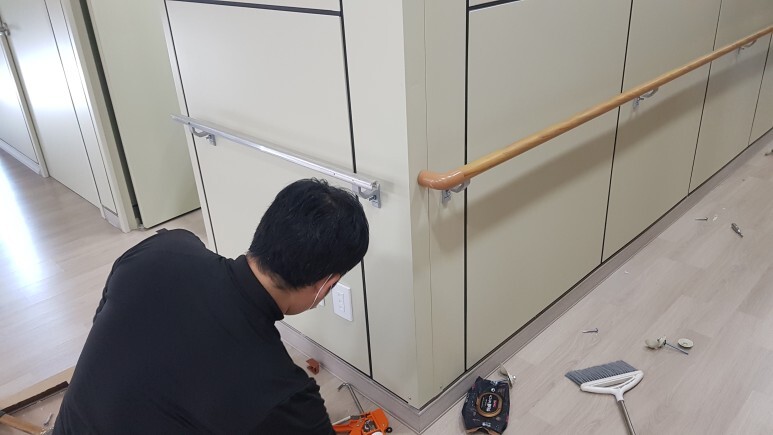 작업 방법: SGP칸막이로 되어있어서 벽부형 핸드레일 설치 시 힘을 못 받기에 볼트를 채워서 힘을 받을 수 있게 고정 하였으며 반대쪽 벽면에 볼트캡을 씌워서 최대한 깔끔하게 작업을 하였습니다. 레벨기을 사용하여 벽면에 일정 높이에 브라켓을 설치합니다. 알루미늄 프레임을 고정되어 있는 브라켓에 거치한 후 피스로 고정시키고 브라켓 커버를 씌웁니다. 유연해진 PVC 핸드레일 피복을 알루미늄 프레임에 위에서 아래로 돌려가며 감싸줍니다. 핸드레일 양쪽 끝에 엘보로 마감 처리하면 작업이 완료됩니다.