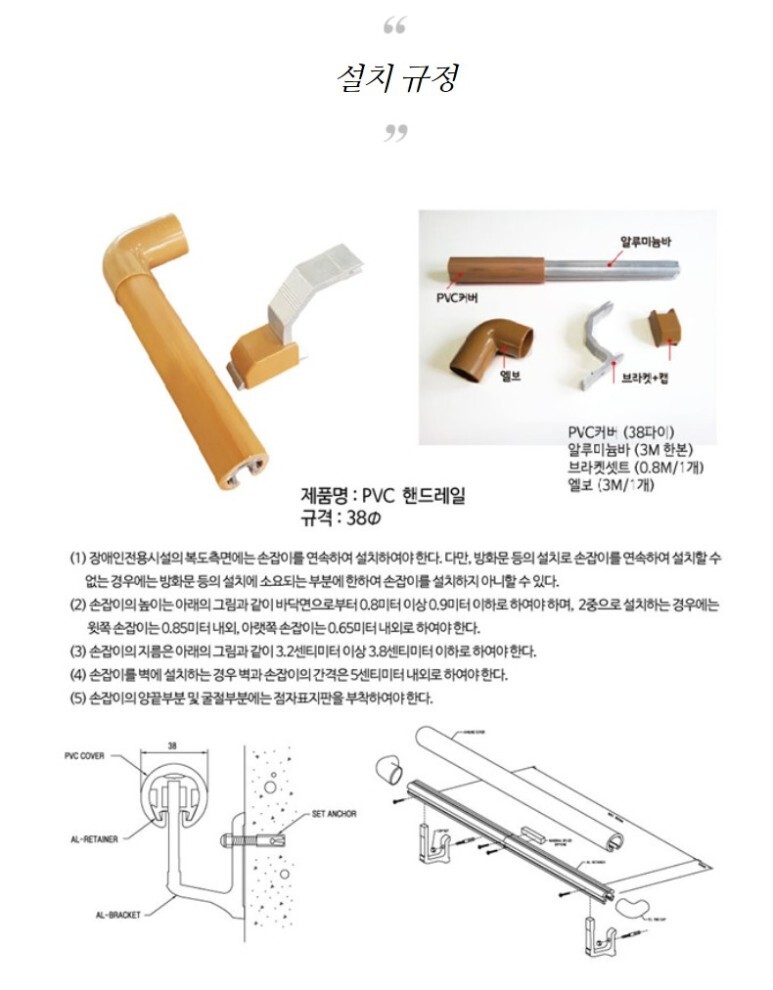 제품 설명: PVC 핸드레일이며 규격은 38파이 알루미늄바, PVC커버 브라켓 셋트 엘보 등으로 작업합니다.
