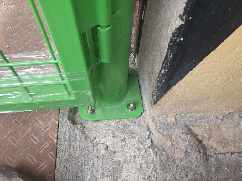 작업 방법: 콘크리트 바닥면에 타공된 앙카홀 위치를 표기후 앙카를 심어 줍니다. 주주의 앙카판에 앙카볼트를 잘 맞춘 후 너트를 이용하여 조여줍니다. 주주를 고정하였으면 메쉬 휀스문을 연결해 주면 작업이 완료됩니다.