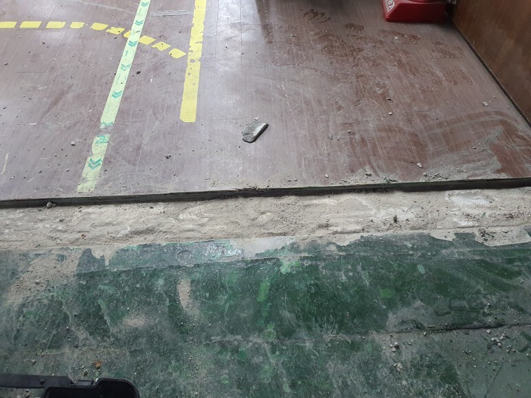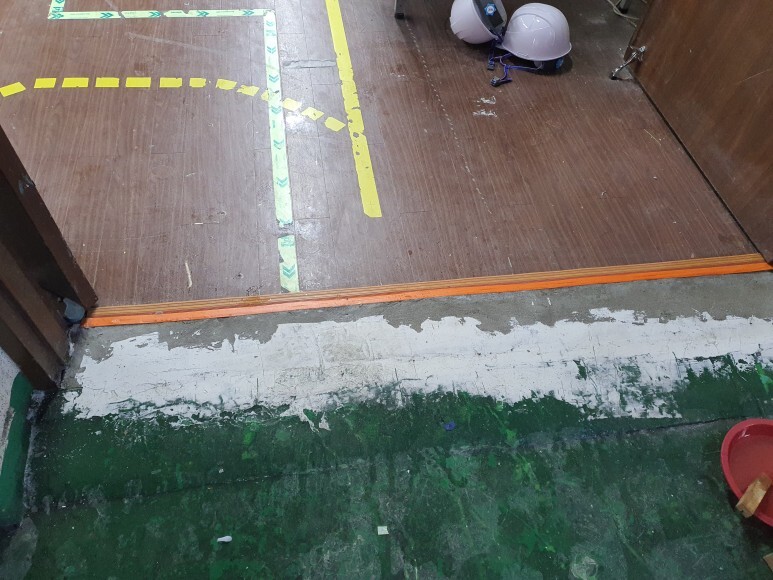 작업 방법: 우선 방화문의 중간 부분을 컷팅 해줍니다. 빠루 및 그라인더, 파괴함마 등을 이용하여 최대한 다른 부위가 파손이 안되도록 철거해 줍니다. 미장 작업 진행 - > 양생 진행 후 - >액상하드너로 미장 부분 강화 -> 기타 부위 외부 퍼티를 이용하여 최대한 경사지게 퍼티 진행 -> 바닥 에폭시 시공 - > 작업 마감으로 진행되었습니다.