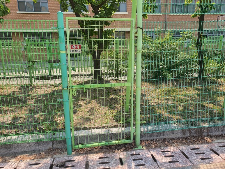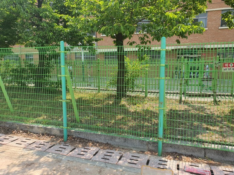 제품 설명: 학교 운동장에 설치되어 있는 메쉬휀스 망 입니다. 관급자재로 일반 메쉬휀스망보다 길이 및 망의 두께도 두껍습니다. 사용된 메쉬휀스망의 길이는 1980 높이 1800의 제품입니다. 보통 메쉬휀스망은 길이 1920이 고정 제품입니다.