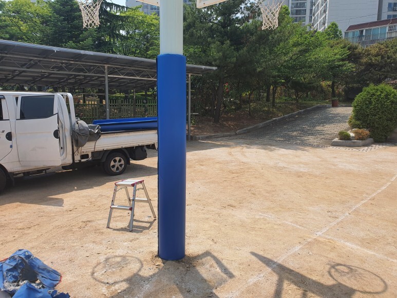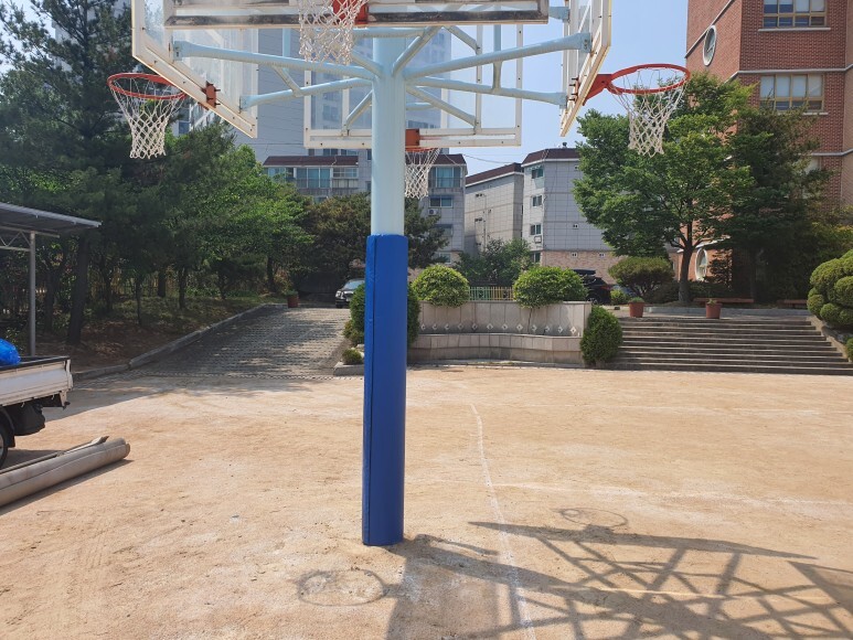 안녕하세요. 갤럭시 종합설비입니다. 농구골대 안전보호대 설치 작업 후기 입니다_인천 서운초등학교 현장 의뢰 내용 1. 농구 골대 안전, 기둥 보호대 설치 2. 납품 및 설치 사진대지 제출