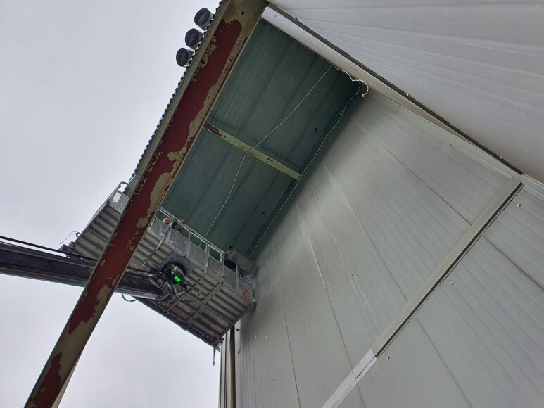 작업 방법: H빔쪽에 H빔 클램프를 이용하여 그물망을 잡아주었고 로프 등을 이용하여 그물망을 최대한 당겨줘서 처짐을 방지하였습니다. 샌드위치 판넬 쪽은 피스를 이용하여 고정작업을 진행하였습니다.