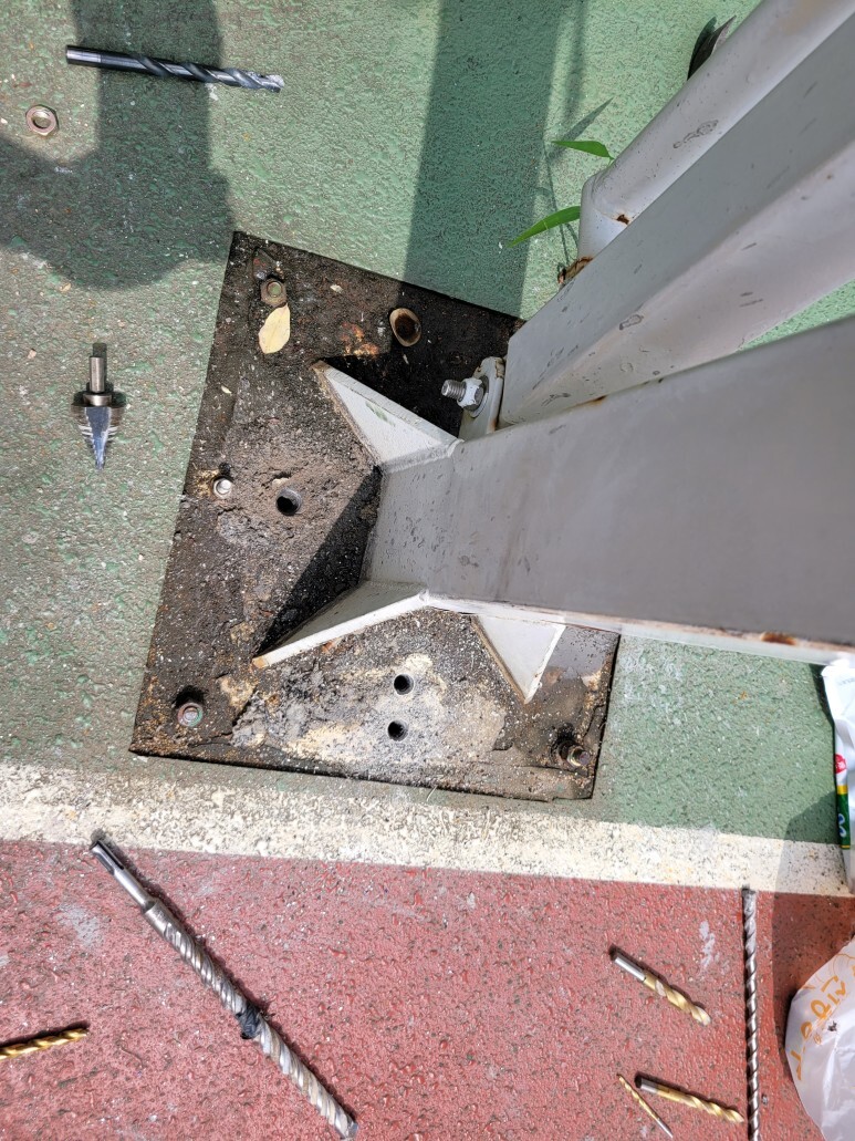 작업 방법: 베이스 플레이트 타공은 철재용 드릴비트로 타공 크기를 키워가면서 타공 작업을 진행하였습니다. 앙카는 1/2 짜리 사용하였으며 칼블럭 스크류 14파이 등을 이용하여 고정작업을 진행하였습니다.