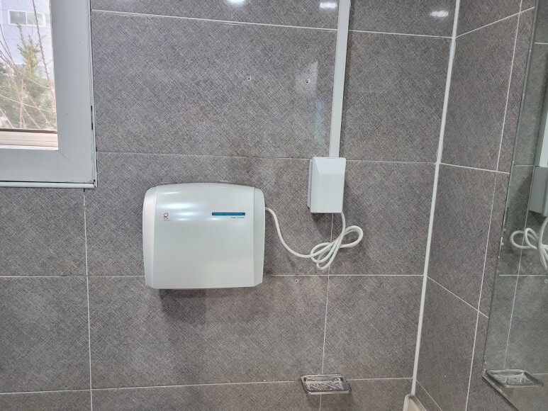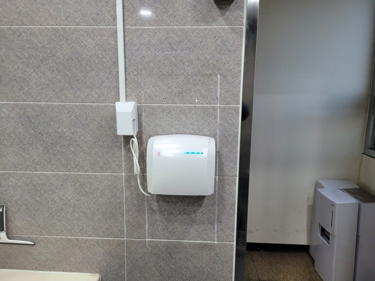 제품 설명: 이번에 설치할 제품은 초고속형 에어타올(핸드드라이어) 제품이며 국내산 제품입니다. 최고 풍속이 130m/s 4단이며 건조시간은 5초 이내입니다. 흡입구 내부 UV 살균으로 세균 번식을 억제하며 주변 온도 감지하여 자동 온풍 토출되는 제품입니다.