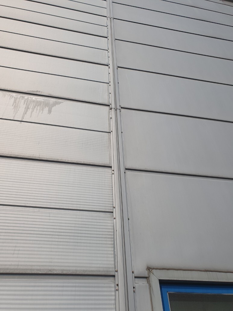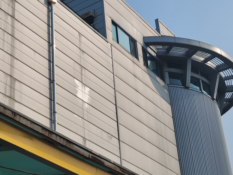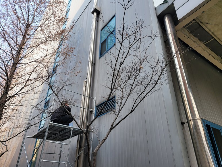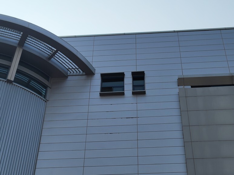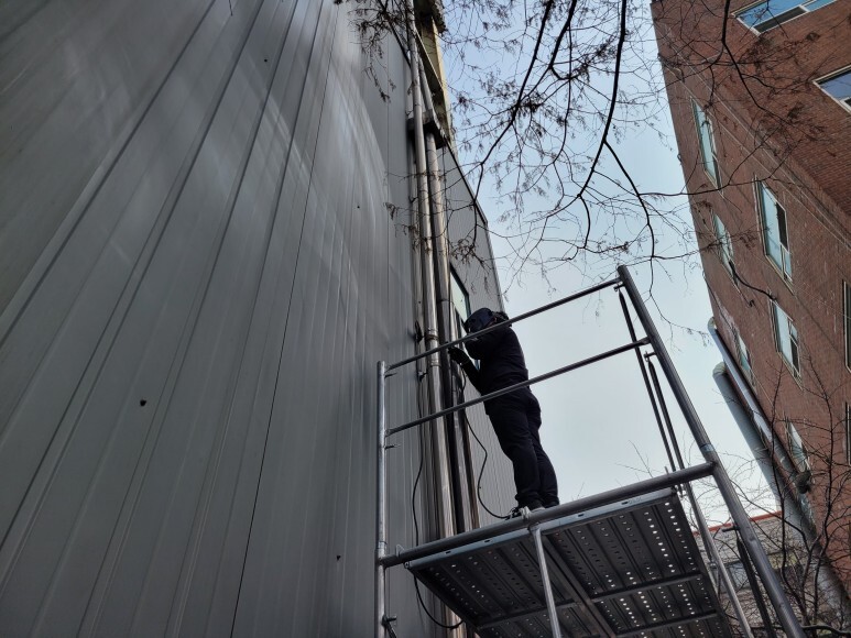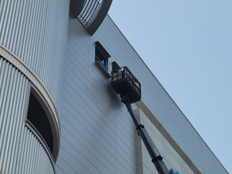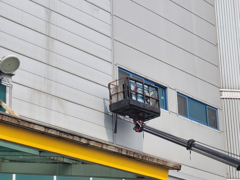 작업 방법: 건물 노후화로 인한 외부 판넬 들뜸 현상이 발생하였습니다. 작업은 3.5ton 고소 작업차를 이용하여 탈락된 판넬에 판넬 피스, 방수 와샤를 이용하여 고정 작업을 진행하였고 외부용 실리콘으로 마감 작업을 하였습니다. 깨진 창문 유리도 3.5ton 고소 작업차를 이용하여 교체 작업도 완료하였습니다.