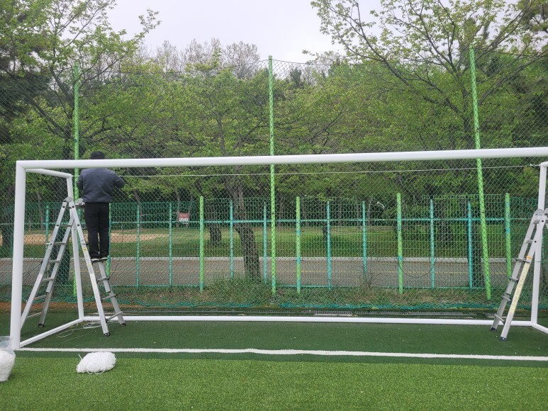 페인트 도색이 완료되었으면 뒤 그물망을 잡을 수 있는 코팅와이어로프를 연결하고 경기용 축구망을 설치하면 작업이 완료됩니다.