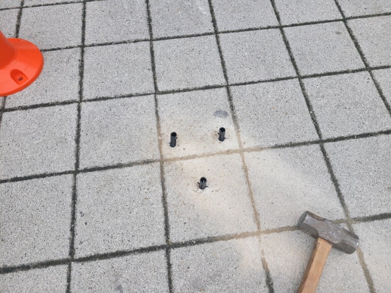 작업 방법: 설치 위치를 선정해야 합니다. 14mm드릴을 이용하여 타공 작업을 진행하고 칼블럭 삽입 후 17폭스알로 볼트를 결합합니다. 주차금지봉이 설치되었으면 비너와 플라스틱 체인 사슬을 연결하여 주차금지 구역을 지정합니다.