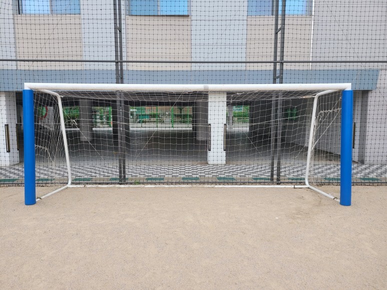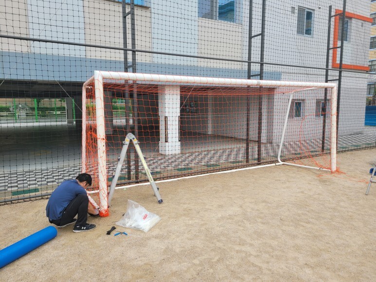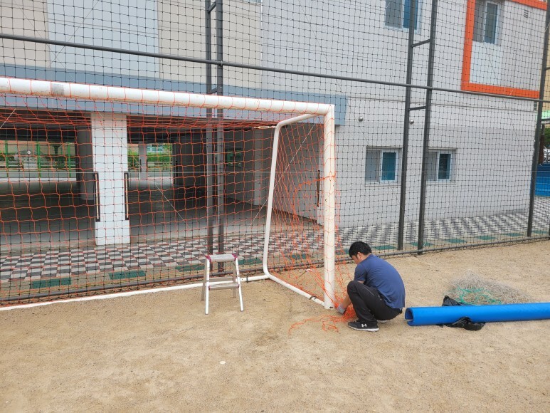 작업 방법: 기존 축구골망, 골대 기둥 보호대 등 철거 작업을 진행합니다. 오렌지 색상 성인용 축구 골망을 씌워주고 축구 골대에 고정 및 연결 작업을 진행한 후 축구 골대 기둥 보호대까지 재설치하면 작업이 완료됩니다. 축구공이 빠지지 않게 꼼꼼하게 작업을 완료합니다.