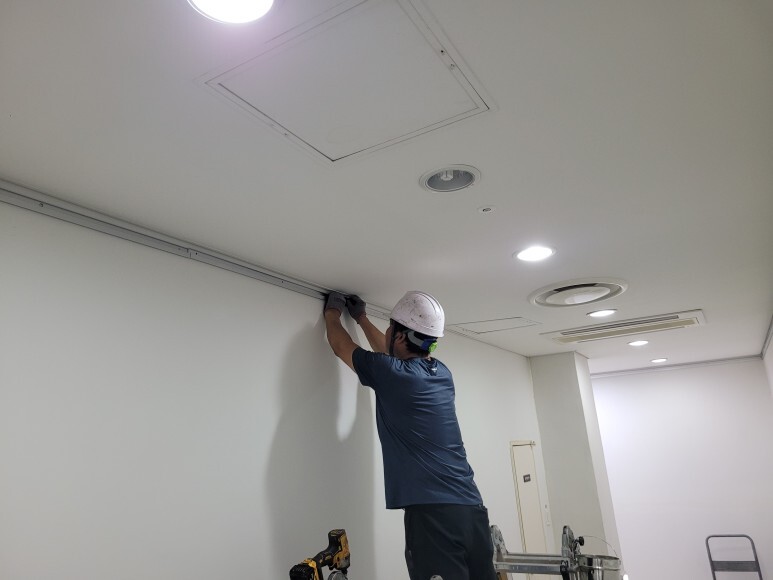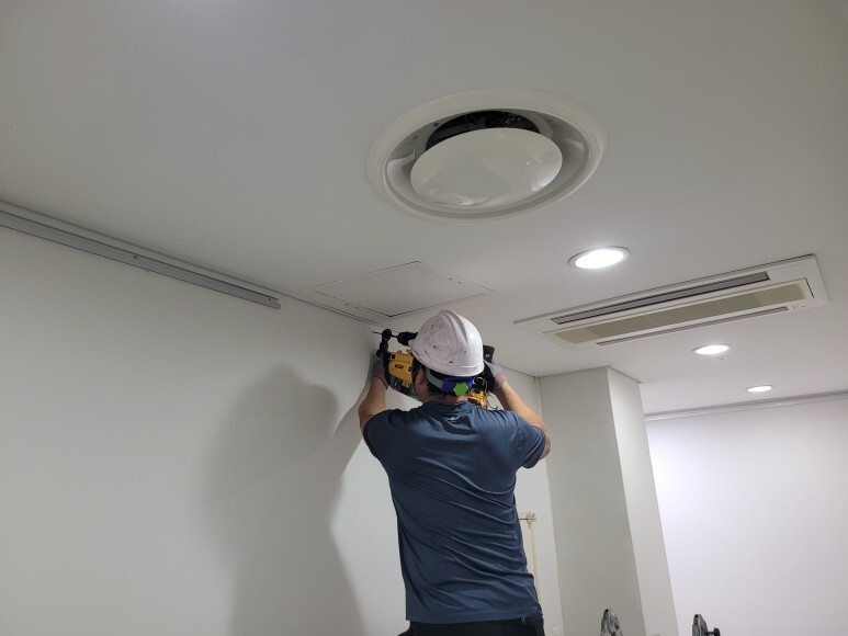 작업 방법: 현장 상황 판단하여 천장형에서 벽걸이형으로 선택하였으며 벽체 상태는 2p 석고보드로 되었있어서 pvc석고 앙카를 설치하고 스터드를 찾아서 고정 작업을 진행하였습니다. 벽체 상태가 콘크리트 일 경우 타공 작업 후 칼블럭 및 고정 작업을 진행하였습니다.