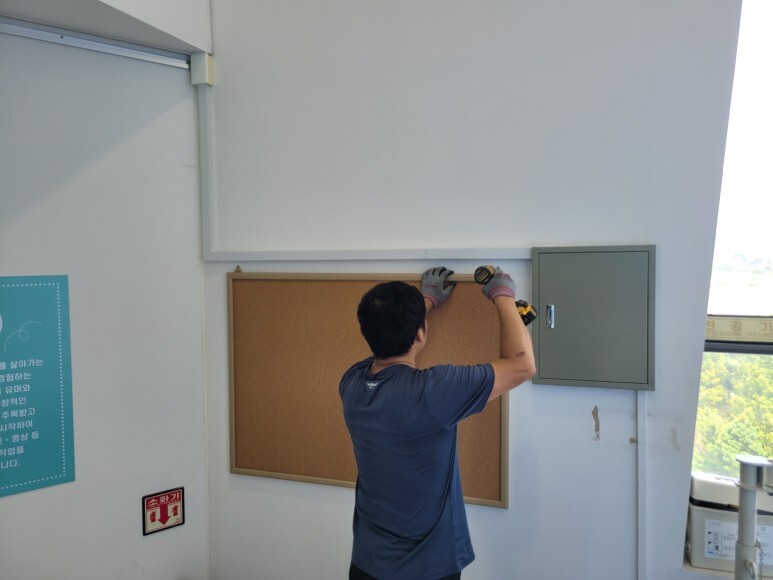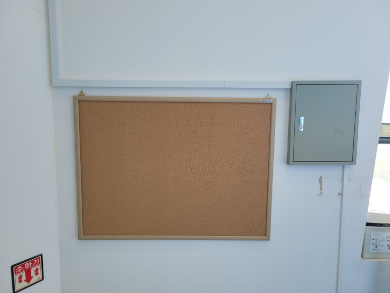 액자 레일의 장점은 액자를 간편하게 교체하거나 이동 할 수 있도록 해주며, 벽에 구멍을 뚫거나 다른 방법으로 액자를 고정하는 것보다 간단하고 깔끔한 방식으로 액자를 전시 할 수 있게 해줍니다.사무실, 회의실, 다양한 공간 어디서나 공지사항, 방명록, 메모 사진등을 게시하고 공유할 수 있는 콜크게시판도 설치 완료 하였습니다.