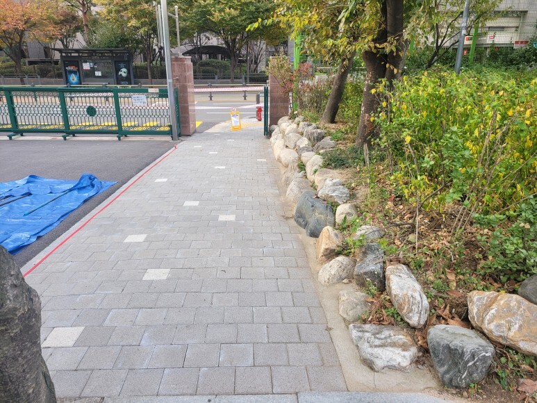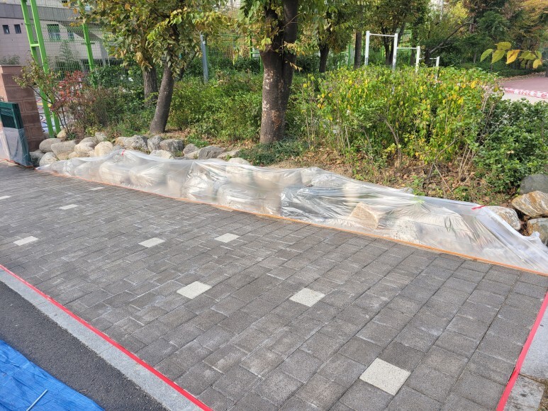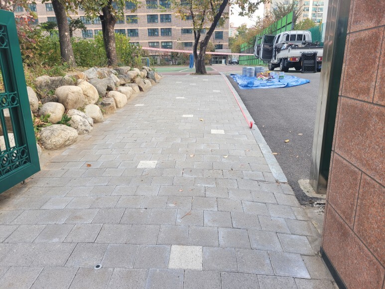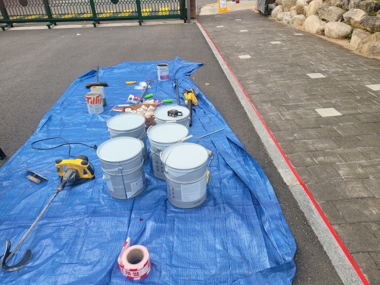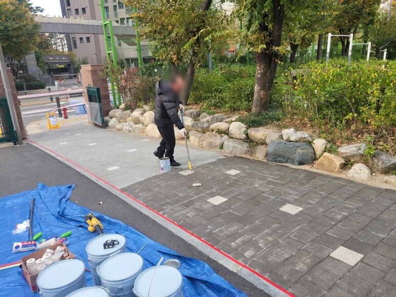 보행로 옆쪽 라인 도색을 진행합니다.