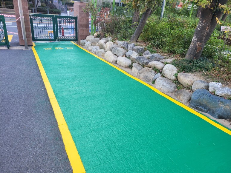제품 설명: 논슬립 페인트 바이로드를 이용하였고 바이로드 제품 중에 M2000 PLUS를 사용하였습니다. M2000 PLUS는 가는 규사가 포함되어 있으며 자전거 도로용, 보행용으로 많이 사용되는 제품입니다.