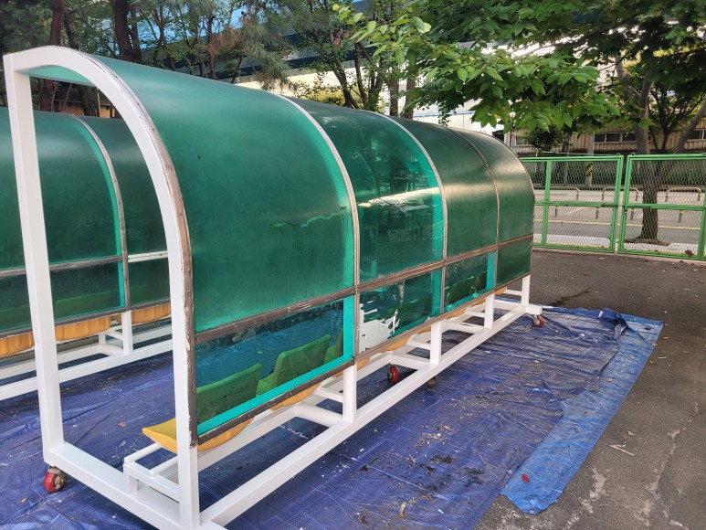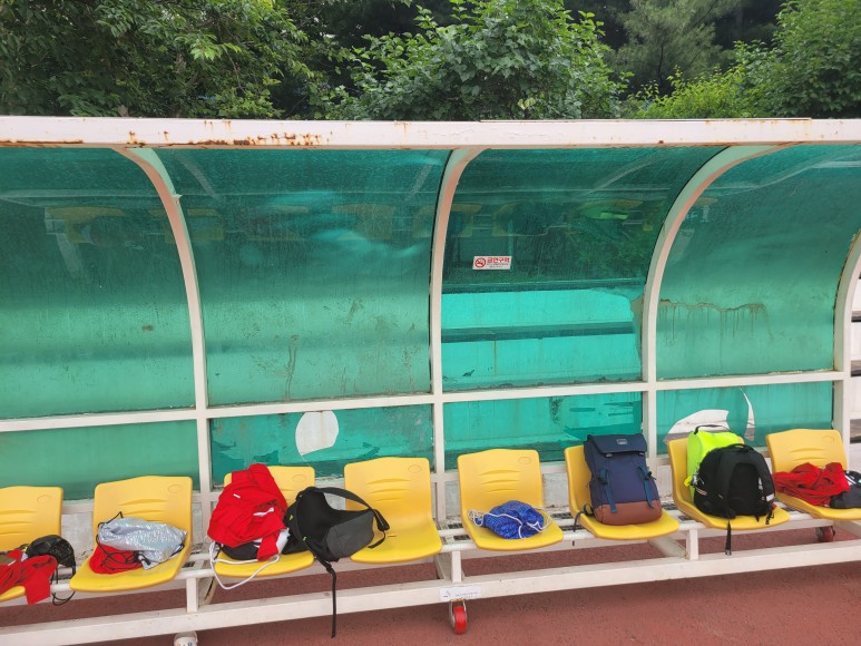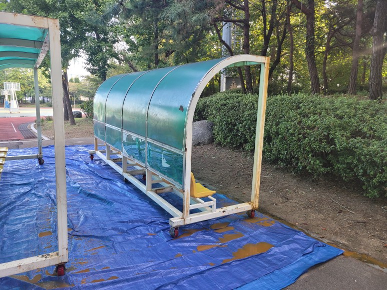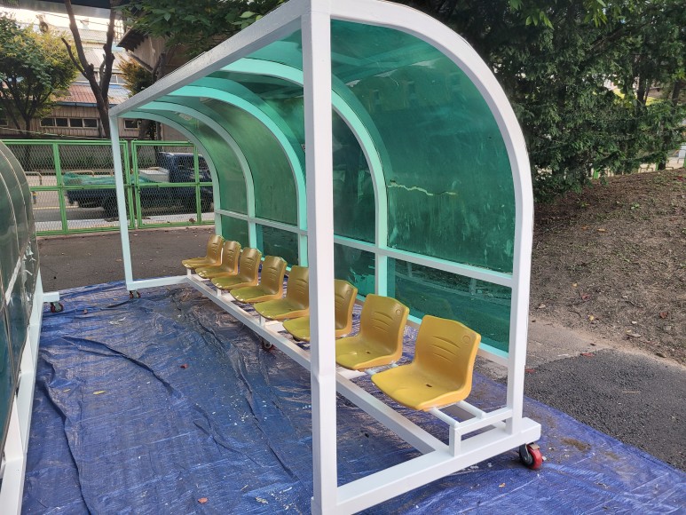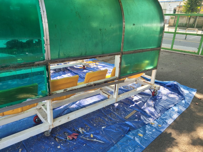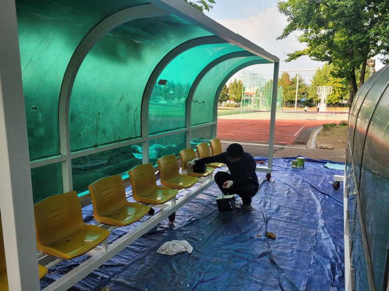 축구장에 선수용 벤치, 선수 대기석 등 선수들이 휴식을 취하거나 출전 전 쉴 수 있는 대기를 할 수 있는 공간입니다. 오래 세월이 흘러서 렉산 부위 파손 부식 등이 발생하여서 선수 대기석을 좀 더 편안하게 쉴 수 있도록 보수 작업을 진행하였습니다.
