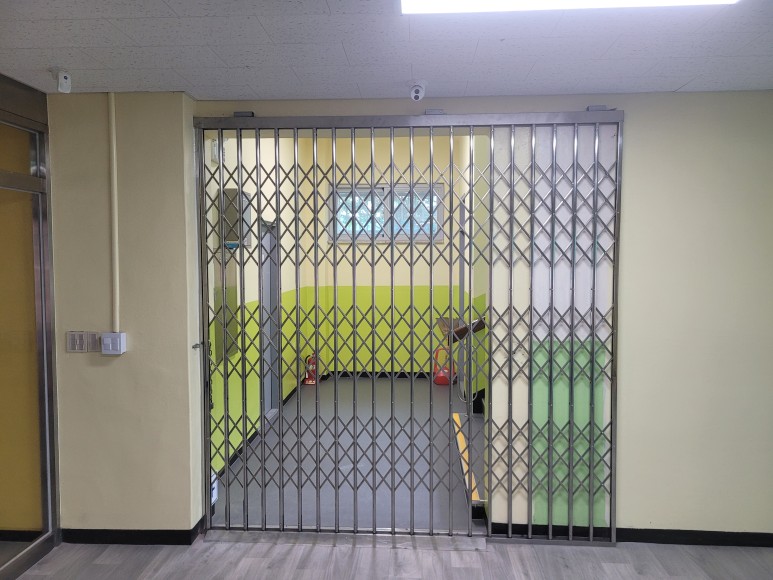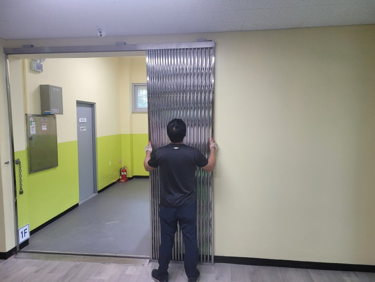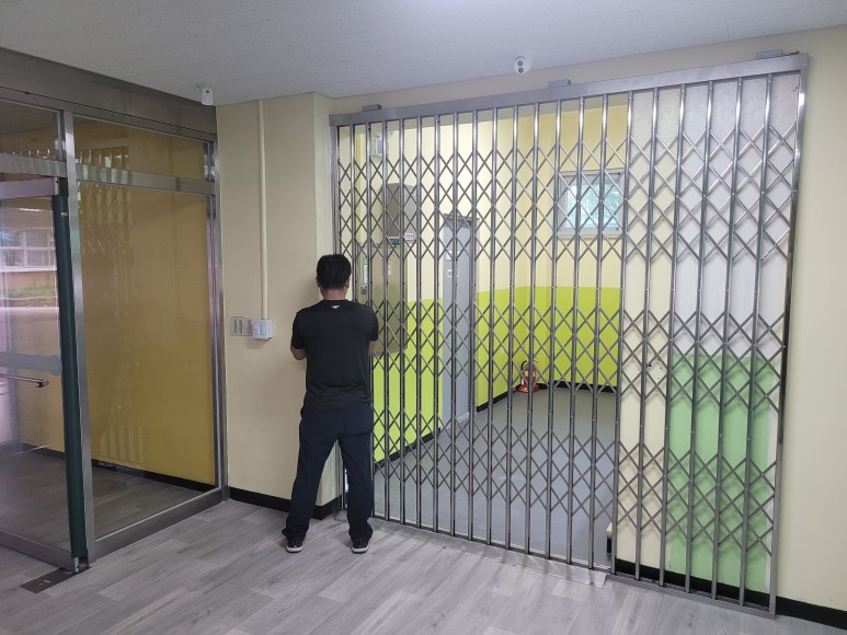 작업 방법: 기존 스텐 자바라 방범창을 철거합니다. 상부 하부, 장금 장치 등 순서에 맞게 철거합니다.