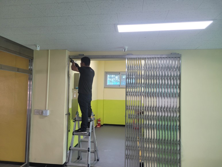 상부, 하부 ㄷ자 몰딩을 설치하고 장금 장치 몰딩 등을 연결하여 벽면에 고정 후 자바라 방범창을 연결하여 작업을 완료합니다.