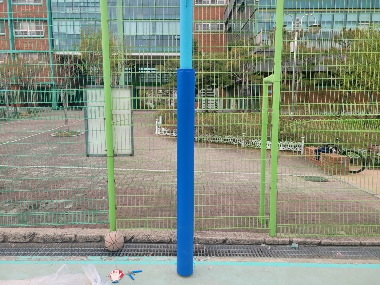 농구골대 기둥 사이즈 확인 후 주문 제작한 기둥 보호대를 설치합니다.