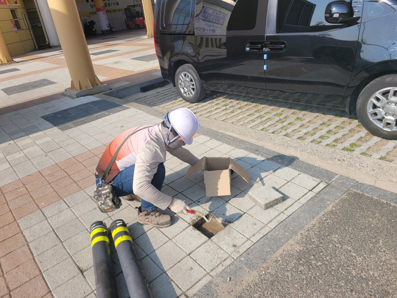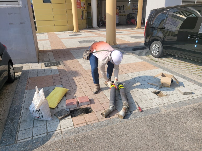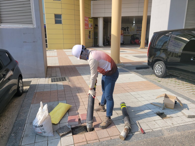 작업 방법: 기존 파손된 I자형 볼라드를 철거합니다. 철거 후 매립된 부분을 사모래, 보도블럭으로 마감합니다. 스텐 U자형 볼라드를 위치를 선정하고 드릴을 사용해 구멍을 뚫습니다. 구멍에 칼블럭을 삽입하고 스텐U자형 볼라드를 고정시킵니다. 올바르게 설치되었는지 최종 점검을 합니다. 볼라드가 단단히 고정되어 있는지, 수평이 맞는지 간격이 일정한지 확인합니다.
