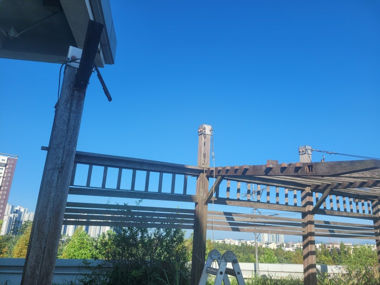 제품 설명: 목재 파고라 입니다. 못, 와이어로프 등으로 연결되어 있는 구조물 입니다.