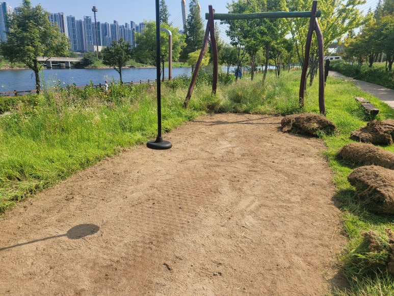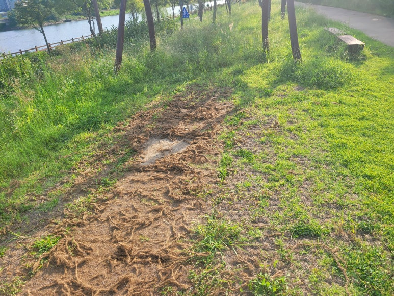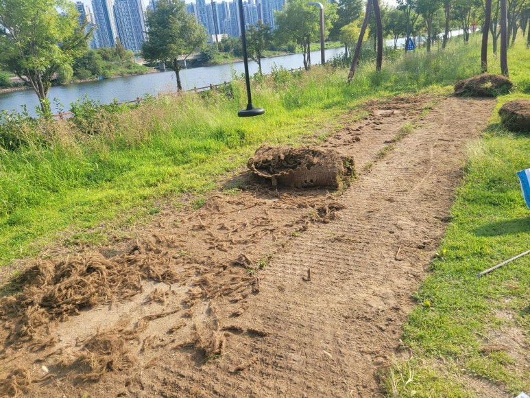 작업 방법: 기존에 설치 되어있던 야자매트 고정핀을 제거 하고 기존 야자매트를 철거합니다. 야자매트가 상당히 무겁기 때문에 분할해서 철거 및 폐기를 진행합니다. 새롭게 제작된 야자매트는 사이즈에 맞게 설치하고 이음쇠 부분은 흙 안쪽으로 말아 고정 후 고정핀을 설치합니다. 흔들리는 부분이 있는지 확인하고 고정핀이 더 필요하다면 고정핀으로 고정 후 작업을 완료합니다.