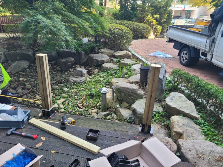 제품 설명: 국내 제조이며 원산지는 유럽산,북미 방부각재 3600*89*38, 3600*120*120(클로버)각재를 이용하여 목재 난간대를 보수하였습니다. 보강 및 연결철물을 메가타이 제품 난간기둥사이 고정재, 사각목재 윗부분에 씌우는 캡, 바닥 고정용 브라켓등을 이용하였습니다.