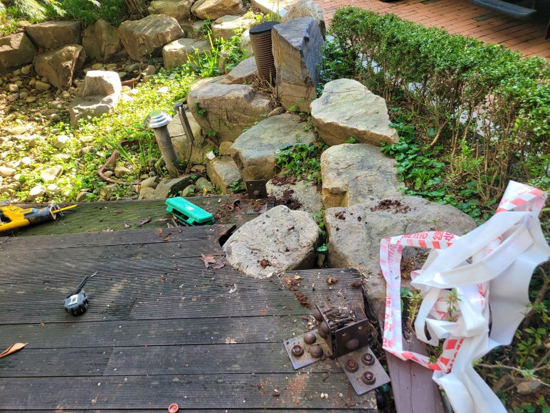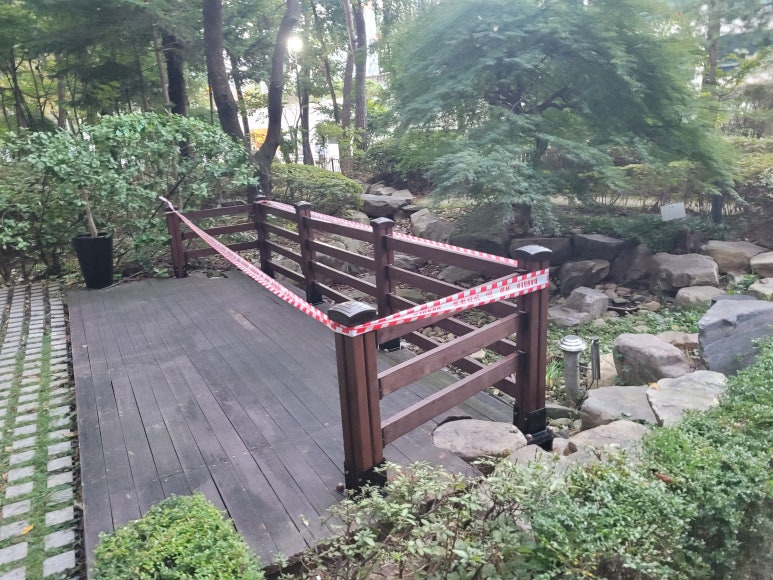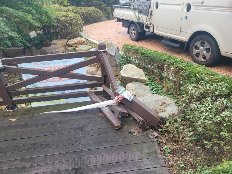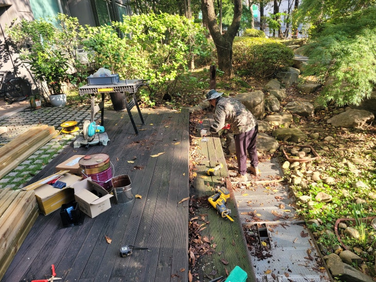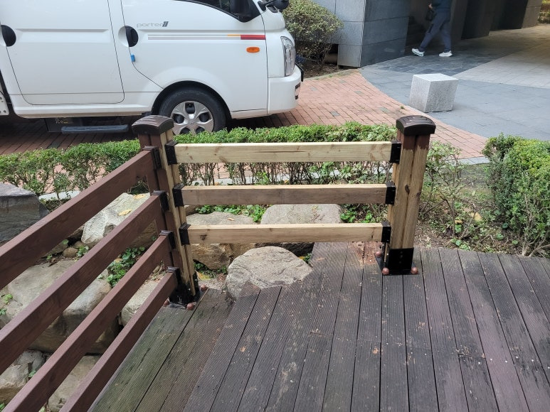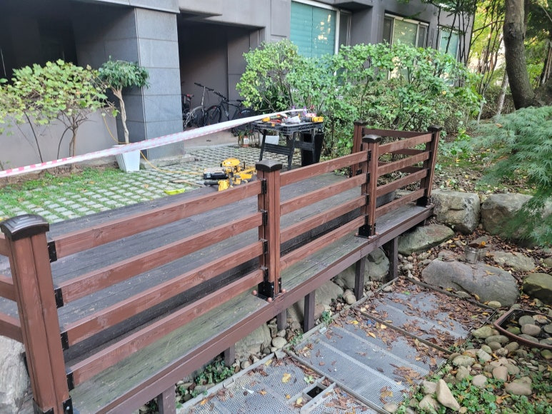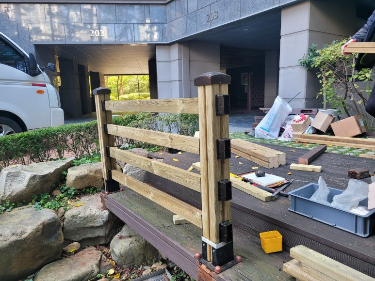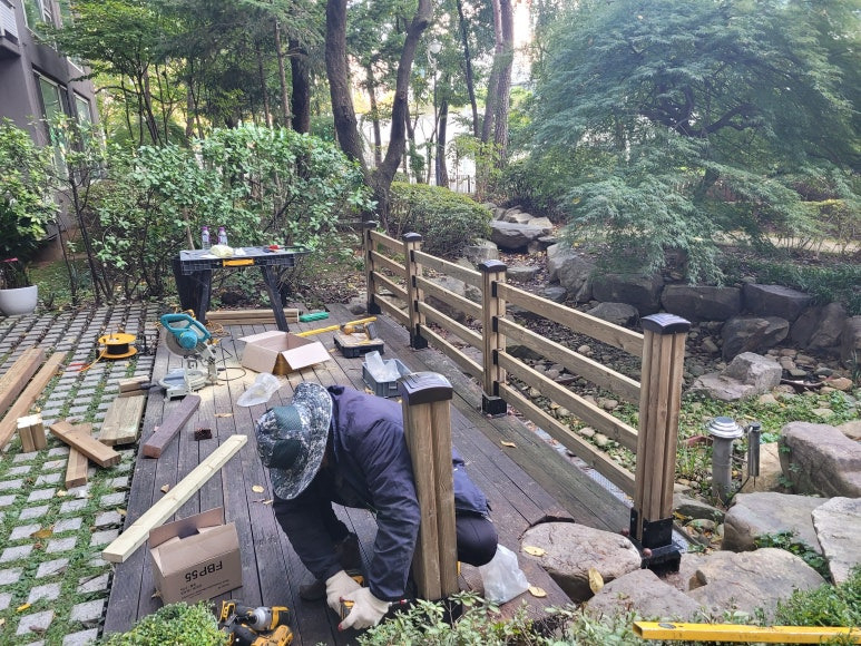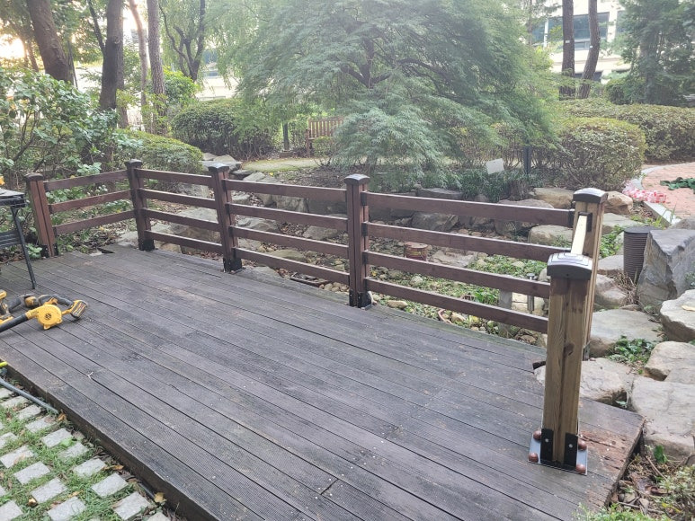 작업 방법: 기존 목재 난간을 제거합니다. 난간대를 고정한 나사나 못을 제거 후 부식되거나 파손된 부분은 신중하게 잘라내어 안전하게 분리합니다. 새롭게 준비한 방부각재를 기존 난간대 치수를 측정하여 동일하거나 적합한 크기의 목재를 준비합니다. 난간대를 기둥에 맞추어 위치를 확인 후 브라켓 등을 바닥에 나사로 고정하여 설치합니다. 목재 난간대가 설치가 완료되면 오일스테인으로 마감 작업을 진행합니다.