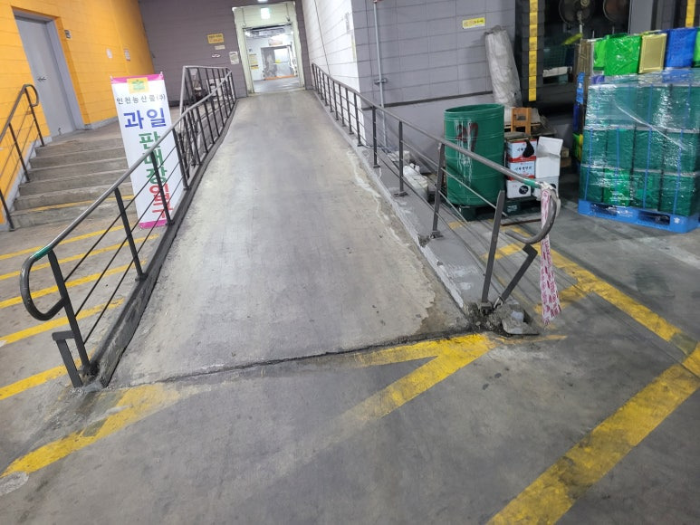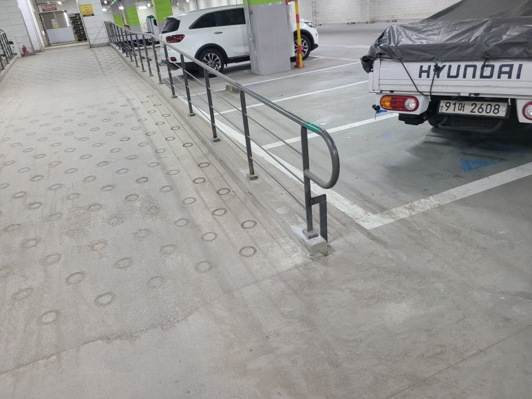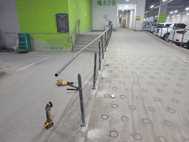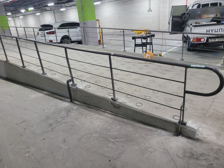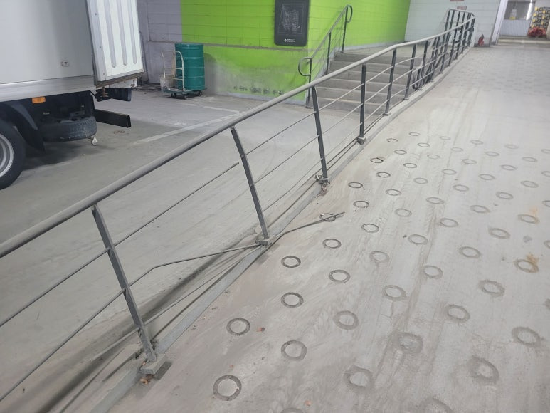 제품 설명: 경사로 난간대 기존 용접 부위 파손, 차량으로 인한 파손이 진행돼서 난간대를 보수 작업을 진행하였습니다. 난간대의 브래킷도 바닥 파손으로 인한 고정이 안돼서 바닥 고정 후 브래킷을 고정하여 흔들리는 상황을 보수하였습니다.