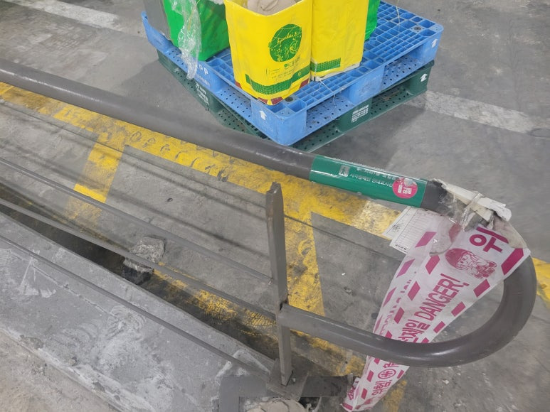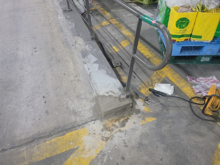 작업 방법: 부식된 부분 및 용접 부위가 떨어진 부위를 다시 용접하여 고정을 진행하였습니다. 바닥 파손으로 인한 난간대 브래킷이 고정이 되지 않아서 거푸집 제작하여 초속경 몰탈을 이용하여 바닥 보수 후 브래킷과 바닥을 고정하였습니다. 난간대 찌그러진 부위는 철거 후 새로운 파이프로 용접 작업을 진행하였습니다.