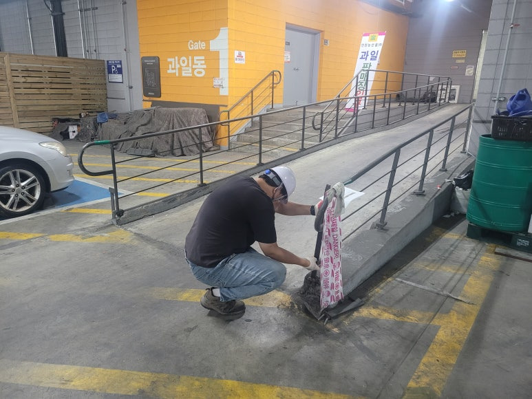 보수 몰탈이 양생이 되면 기존에 파손된 난간대를 바닥에 고정합니다.