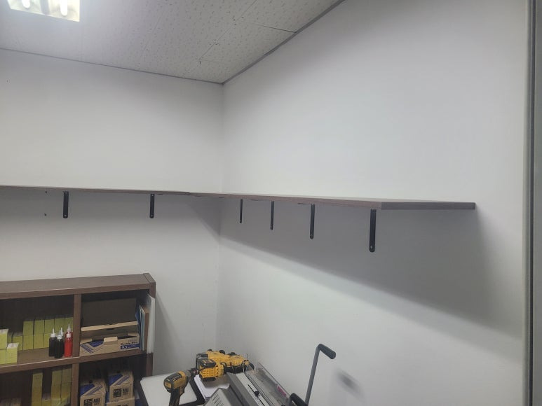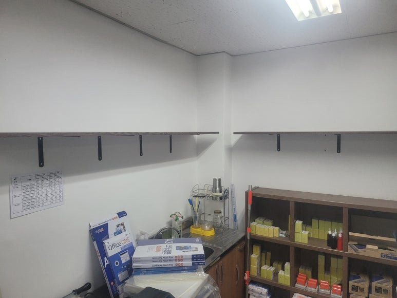 작업 진행 방법: 벽선반 설치 위치 선정 및 사이즈를 측정합니다. 벽선반을 설치할 공간을 정합니다. 물건들의 크기와 무게를 고려하여 위치를 선정합니다. 줄자와 연필을 사용해 선반의 위치를 표시하고 선반이 수평을 유지할 수 있도록 수평자를 사용해 마킹 작업을 진행합니다. 마킹 작업 후 타공 후 ㄱ자 브라켓을 설치합니다. 브라켓이 설치되었으면 목재 벽선반을 ㄱ자 브라켓에 고정하면 작업이 완료됩니다.