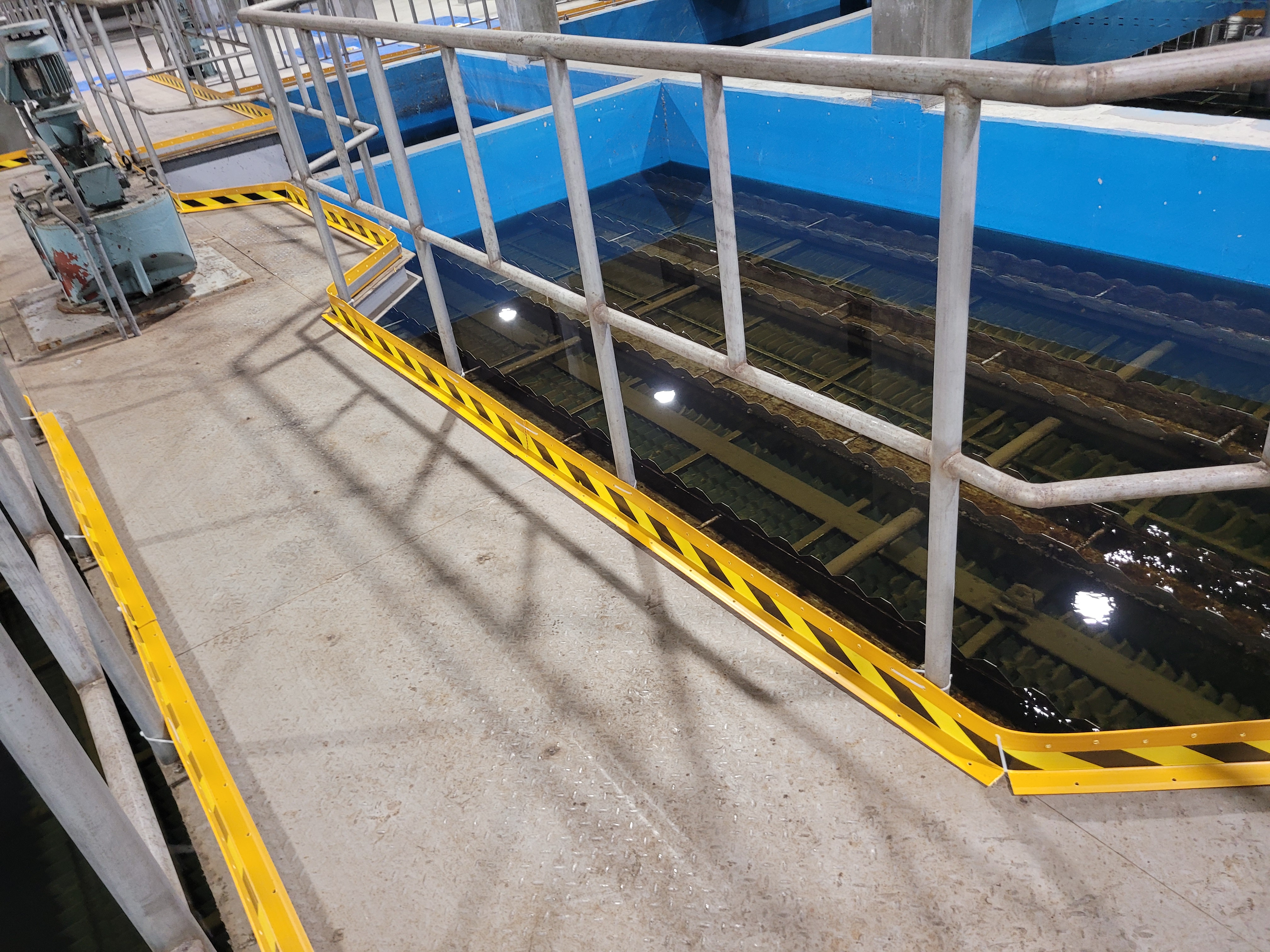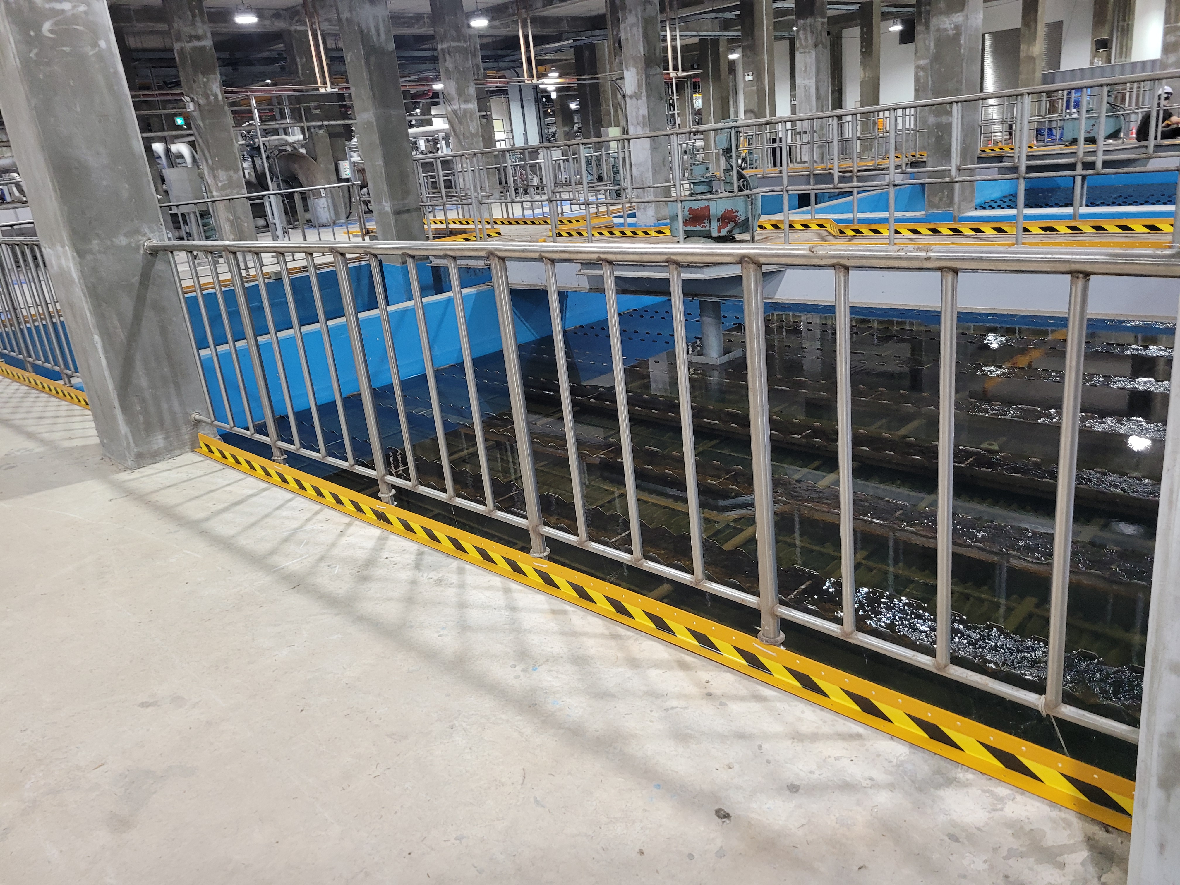제품 설명: 이번 현장에 설치 된 발끝막이판의 종류는 PVC제품이며 높이는 H100 넓이 50L 길이는 3000mm 짜리 제품입니다. 노란색 바탕에 중요한 표시를 위해 노랑사선 검정 라인 마킹테이프를 부착하여 안전 표시를 강화했습니다.
