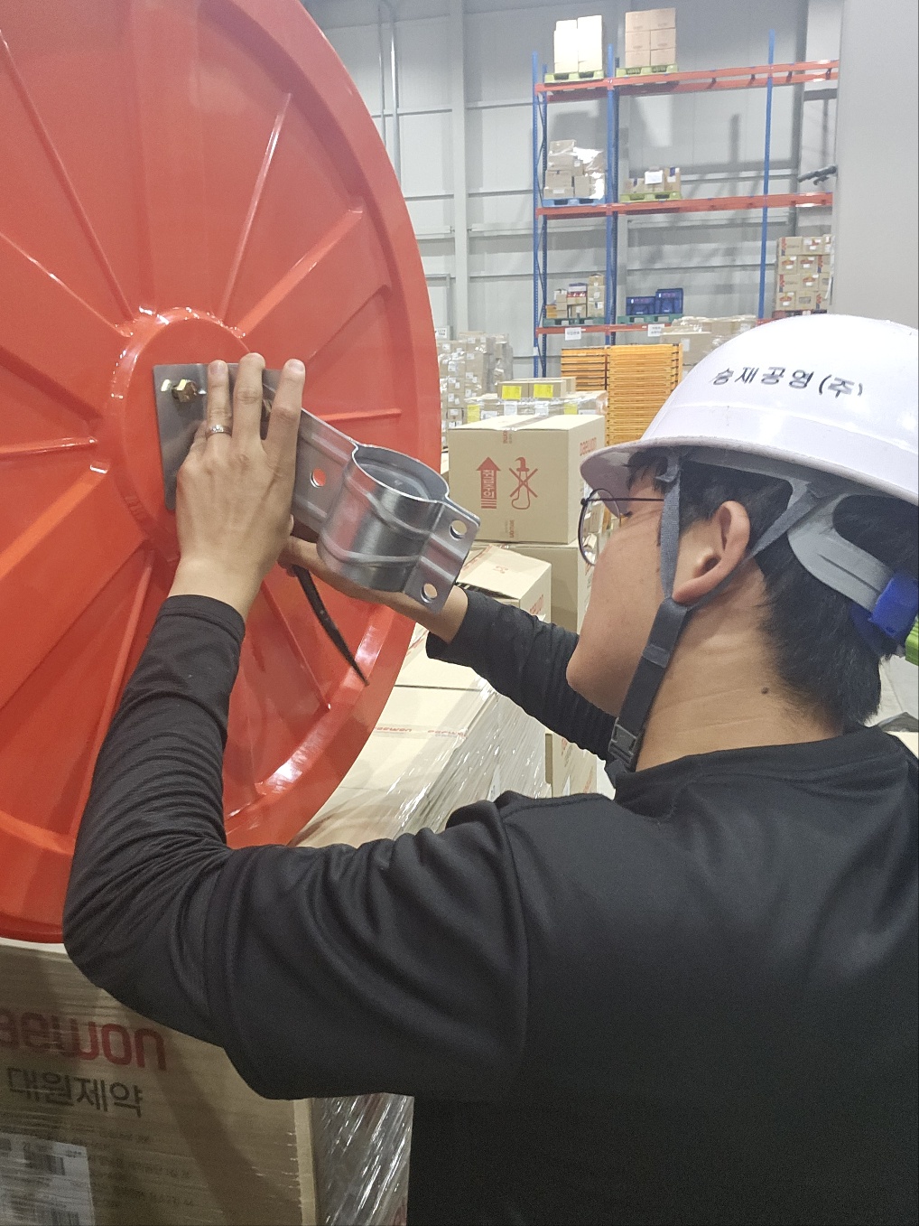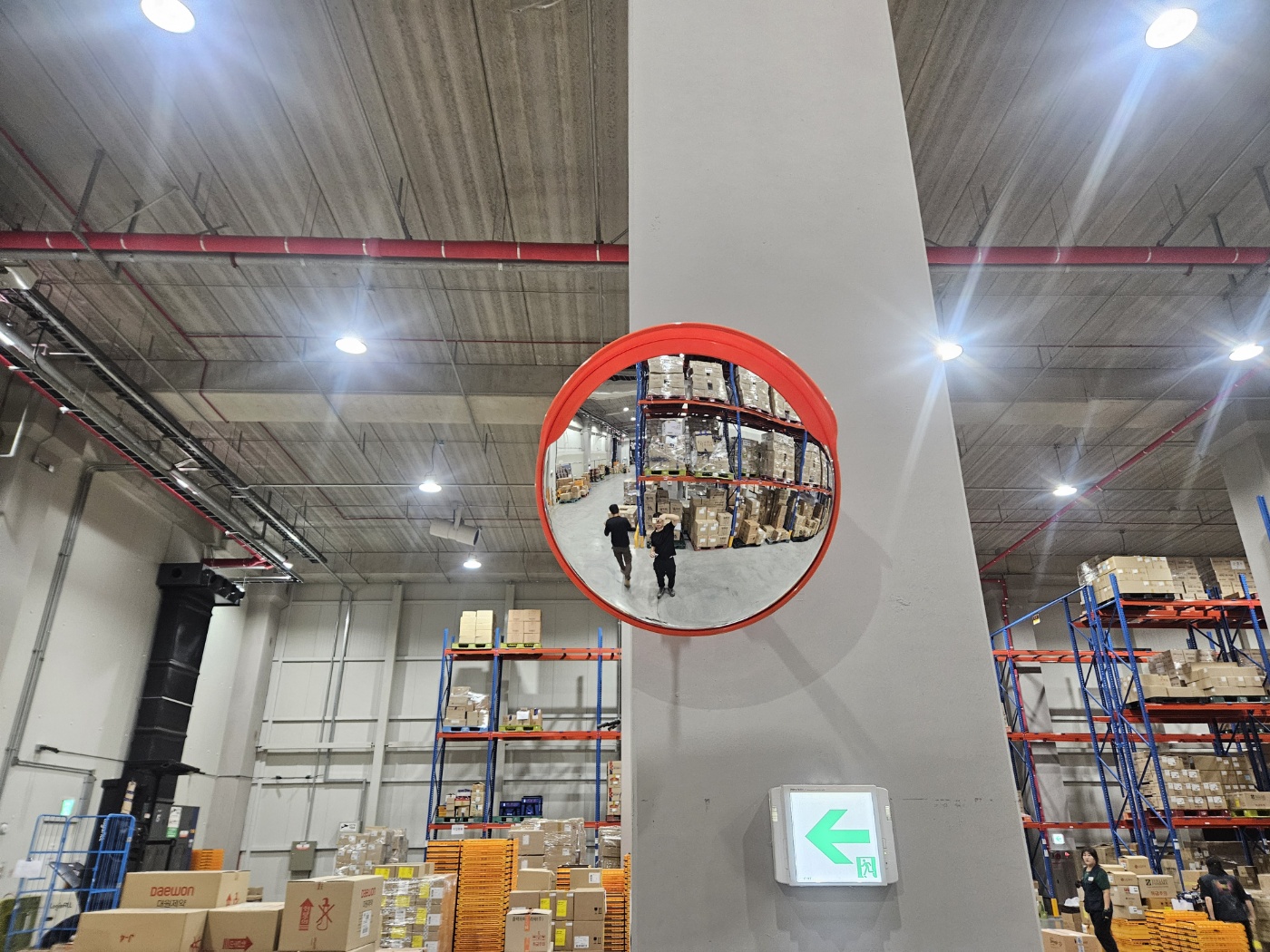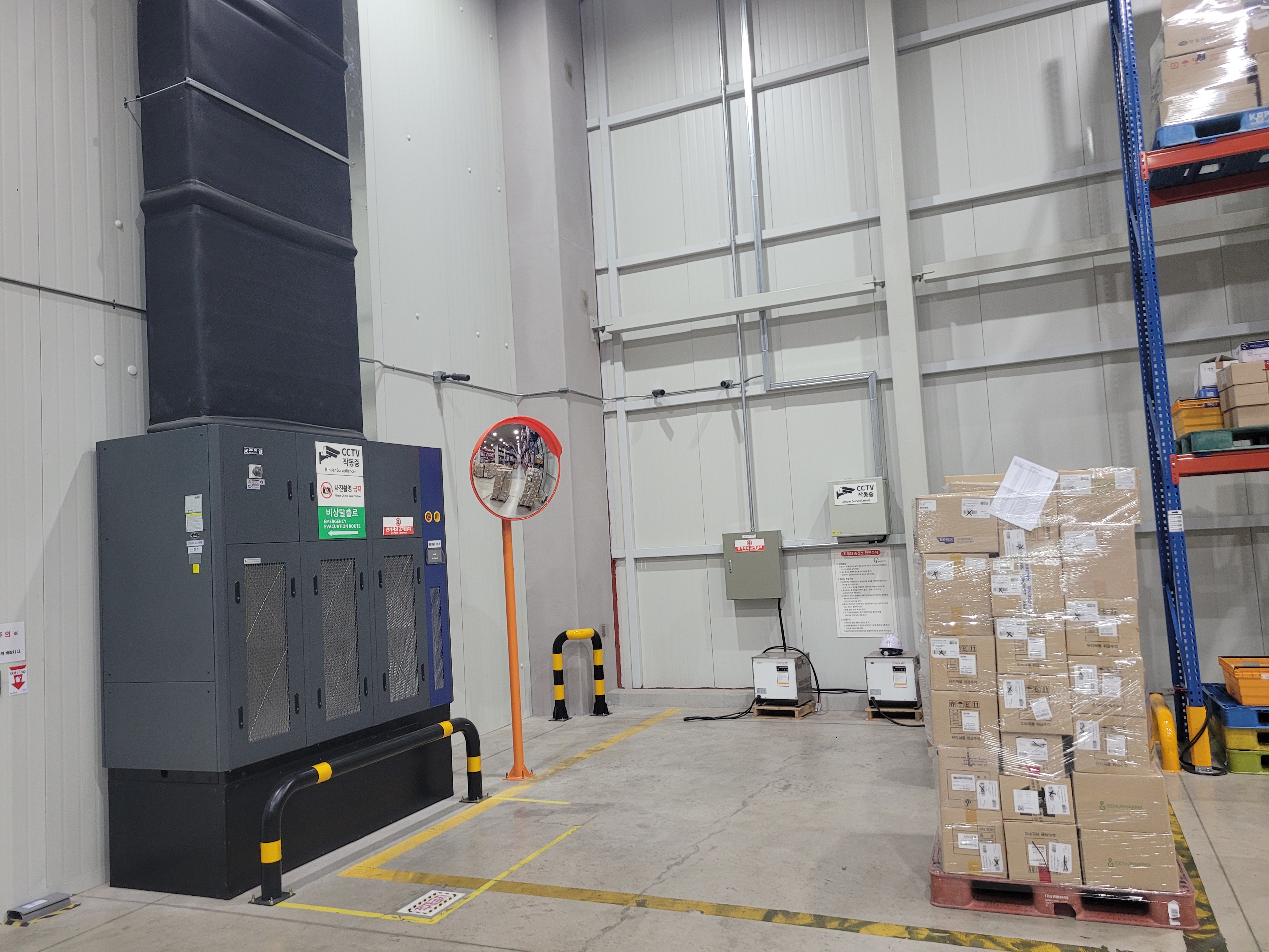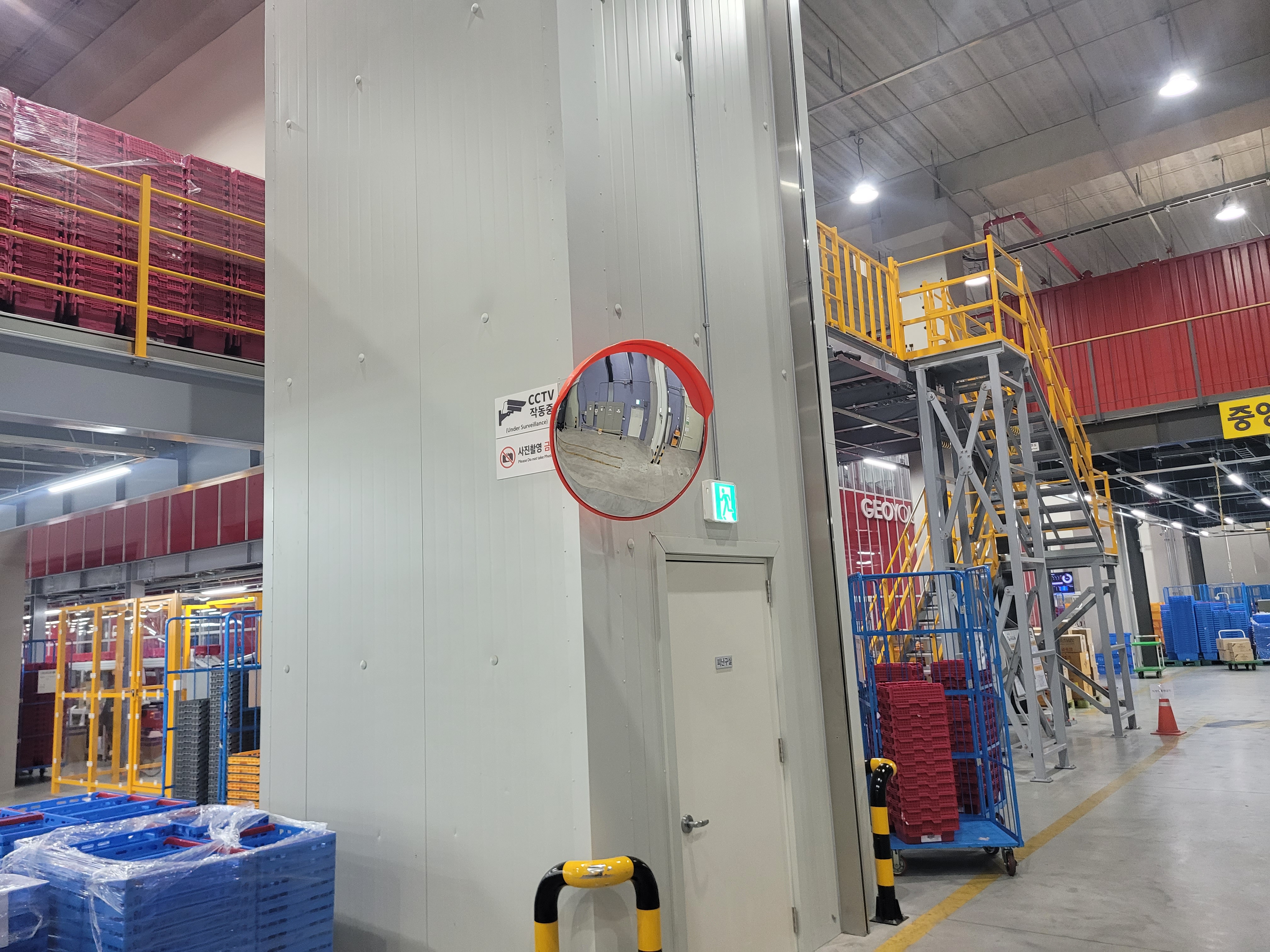 작업 진행 방법: 현장을 돌며 지게차와 차량의 주요 동선을 체크하고 위험 구간을 파악합니다. 교차 통로 모서리 출입구 대형 기둥 주변 등 사각지대가 발생하는 지점에 설치합니다. 내부는 벽면 브라켓 방식, 기둥형 방식으로 지주를 설치 합니다. 실제 차량 이동을 통해 사각지대가 완전히 해소되는지 확인 후 조정합니다.