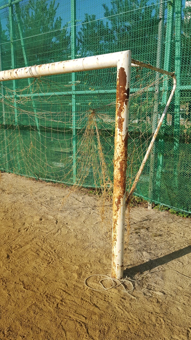 페인트가 벗겨지고 녹이 쓴 축구 골대 페인트 작업입니다.