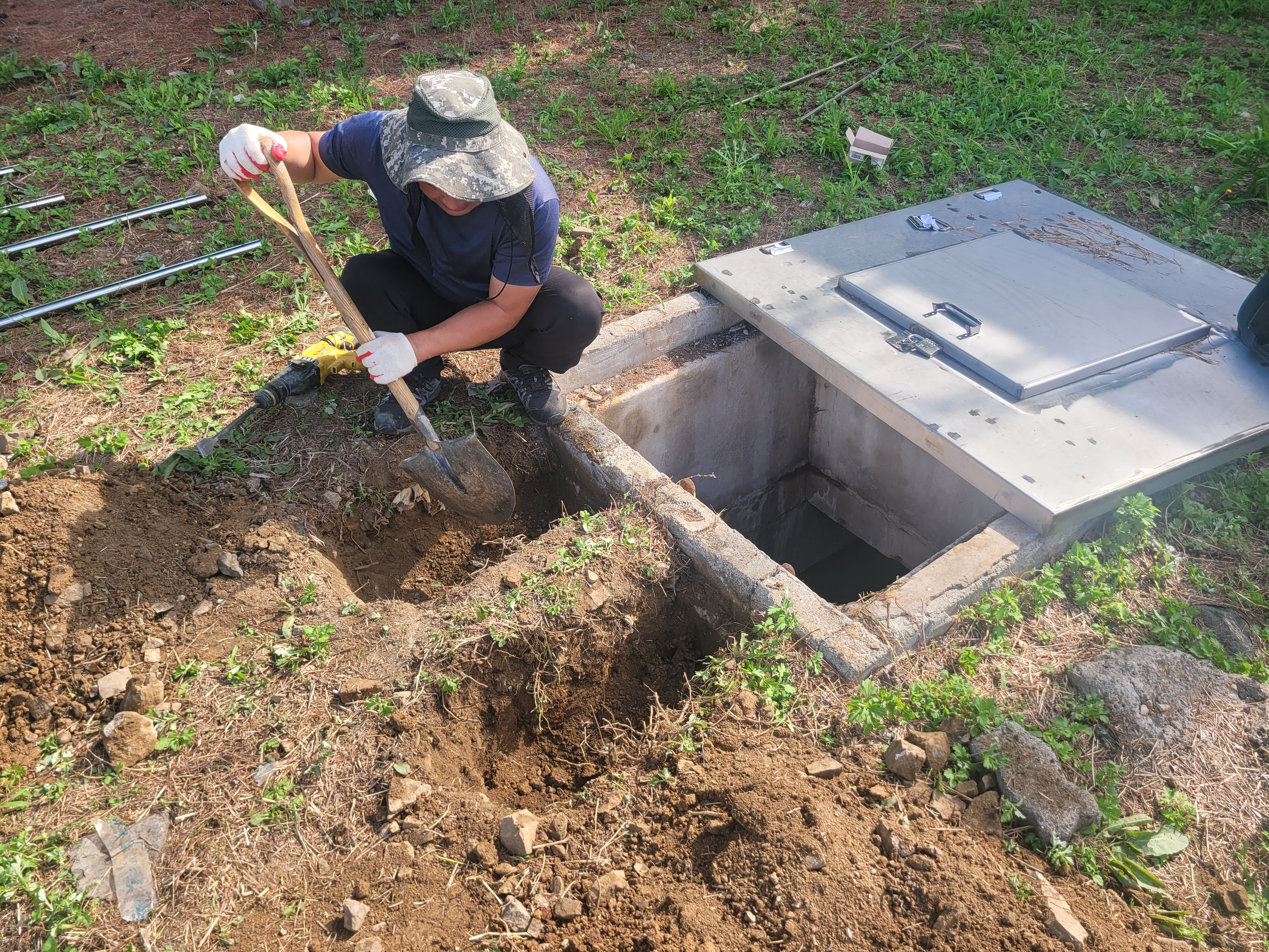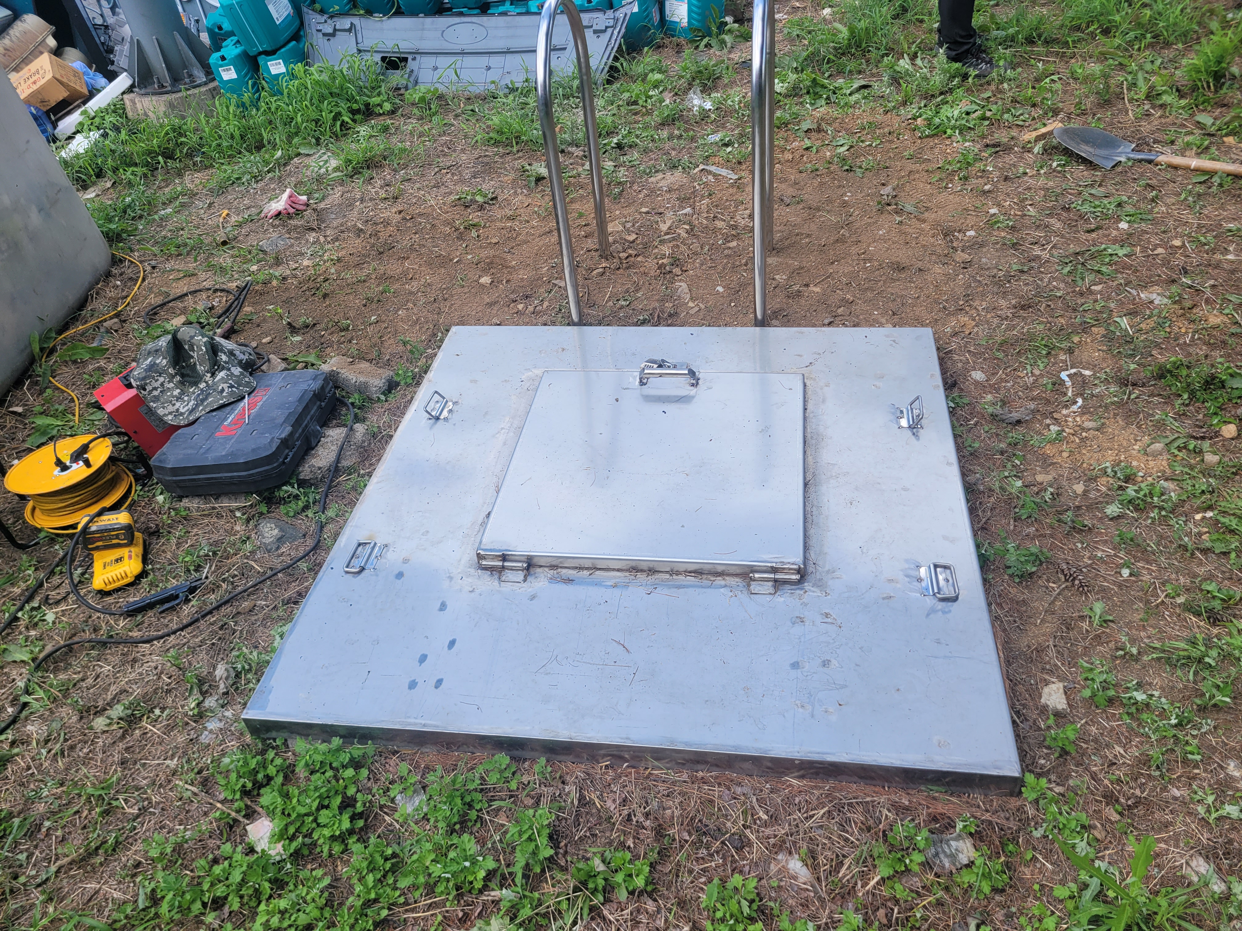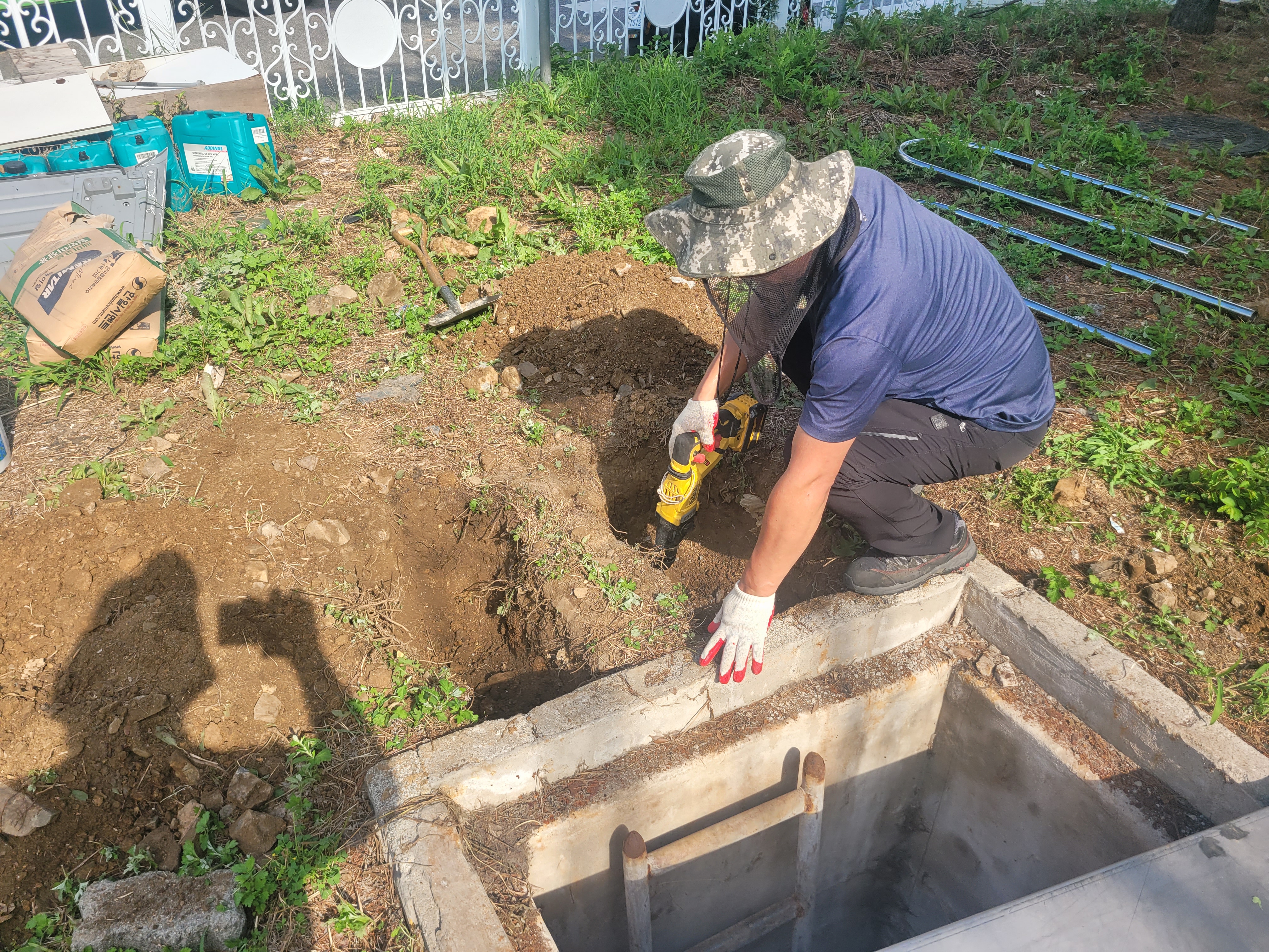 작업 진행 방법: 위치 선정을 진행합니다. 정화조 맨홀 입구 좌우측에 손잡이가 설치되도록 설계, 작업자가 사다리를 잡기 전에 손잡이를 먼저 잡을 수 있는 위치가 이상적 입니다. 흙바닥에 콘크리트를 부어서 양생 해 고정 하였습니다.