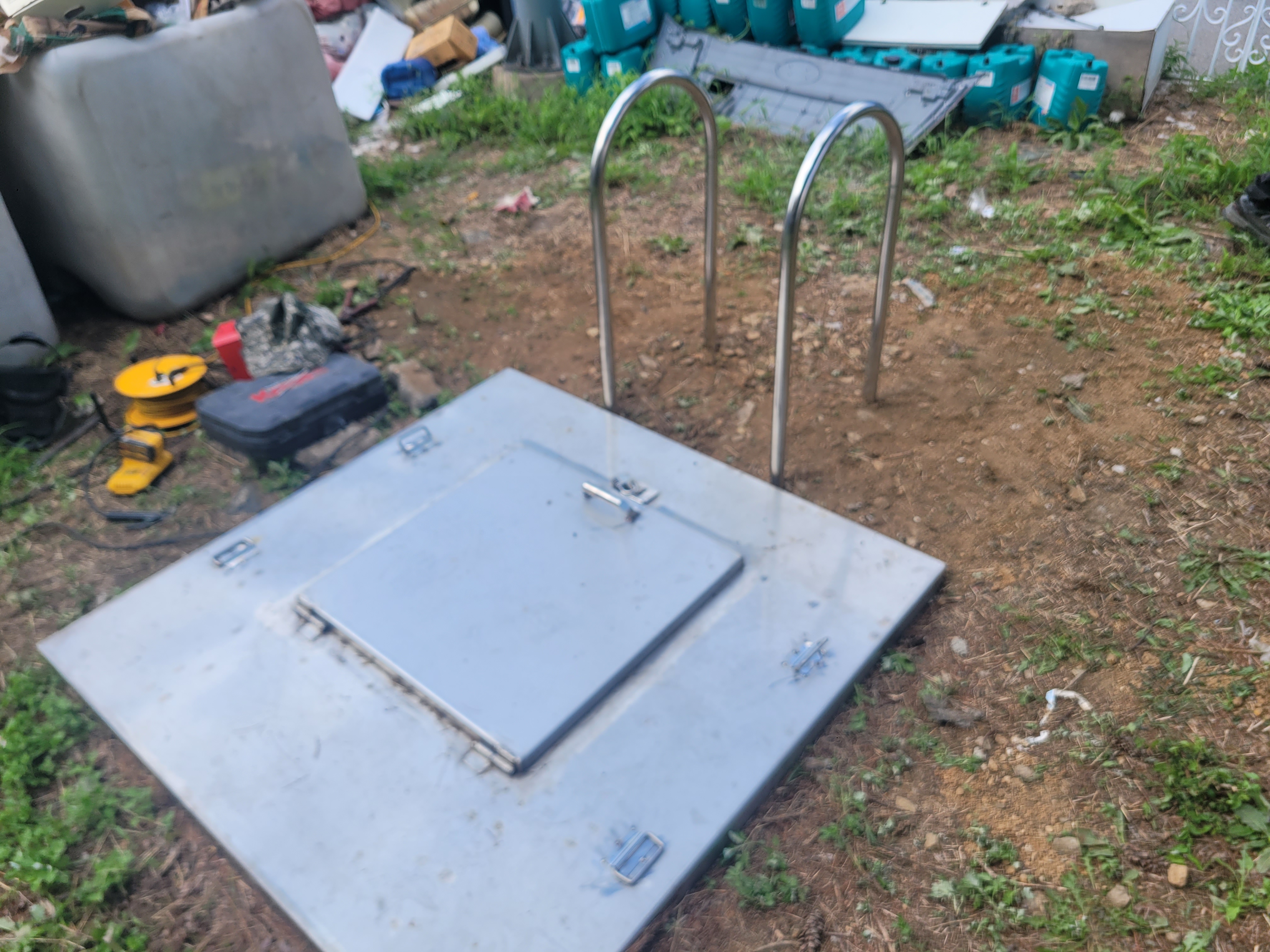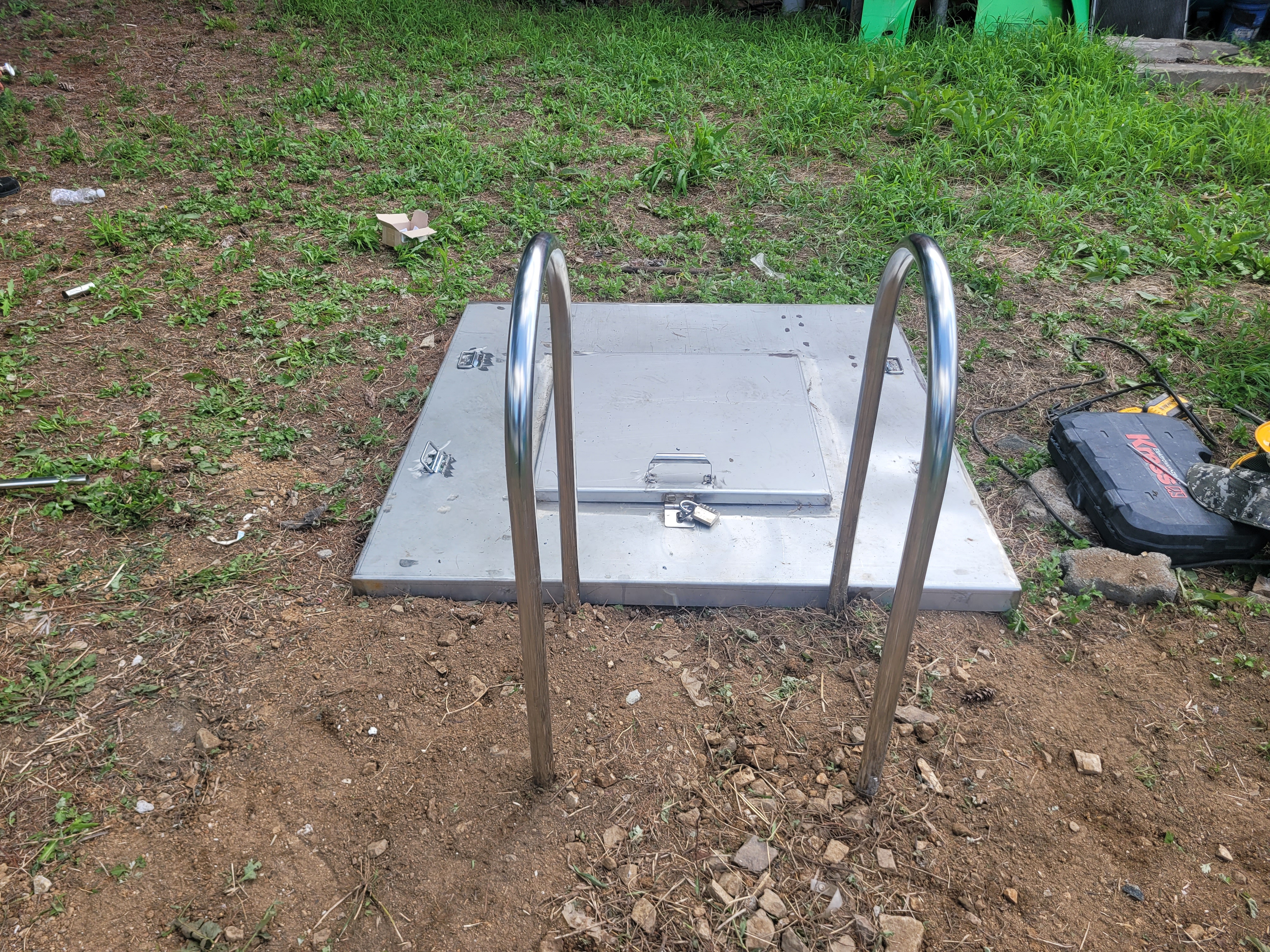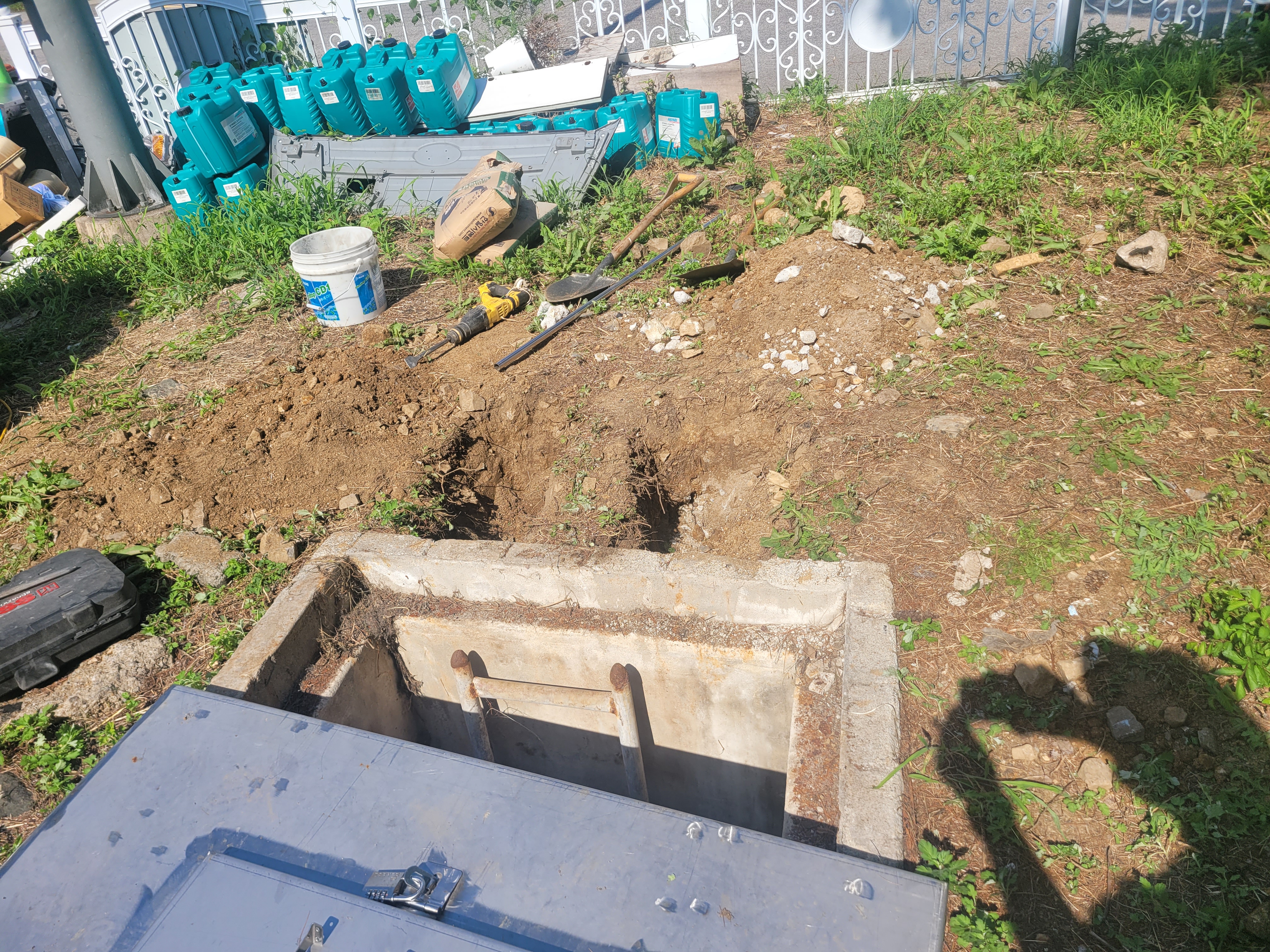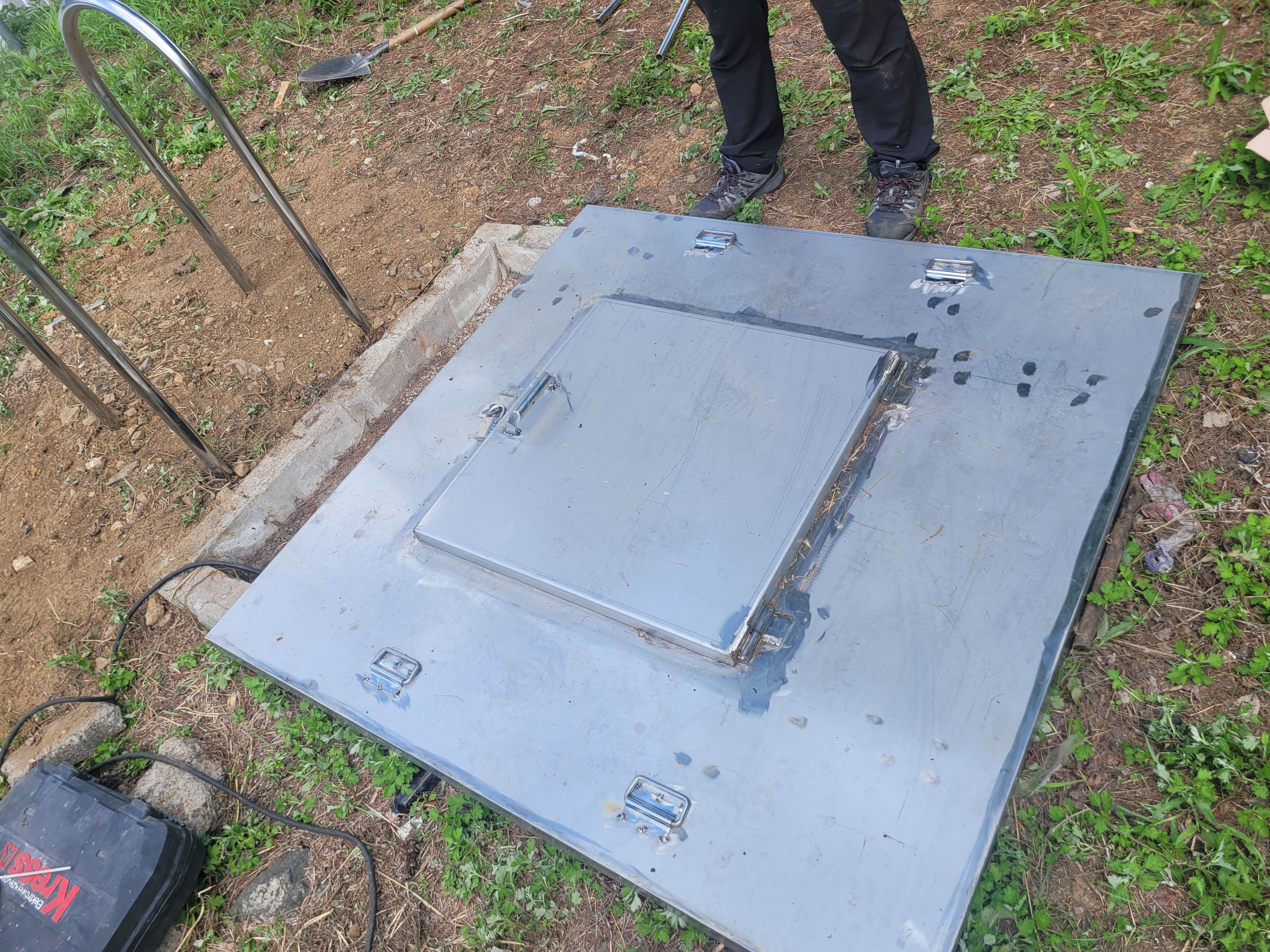 작업 진행 방법: 위치 선정을 진행합니다. 정화조 맨홀 입구 좌우측에 손잡이가 설치되도록 설계, 작업자가 사다리를 잡기 전에 손잡이를 먼저 잡을 수 있는 위치가 이상적 입니다. 흙바닥에 콘크리트를 부어서 양생 해 고정 하였습니다.