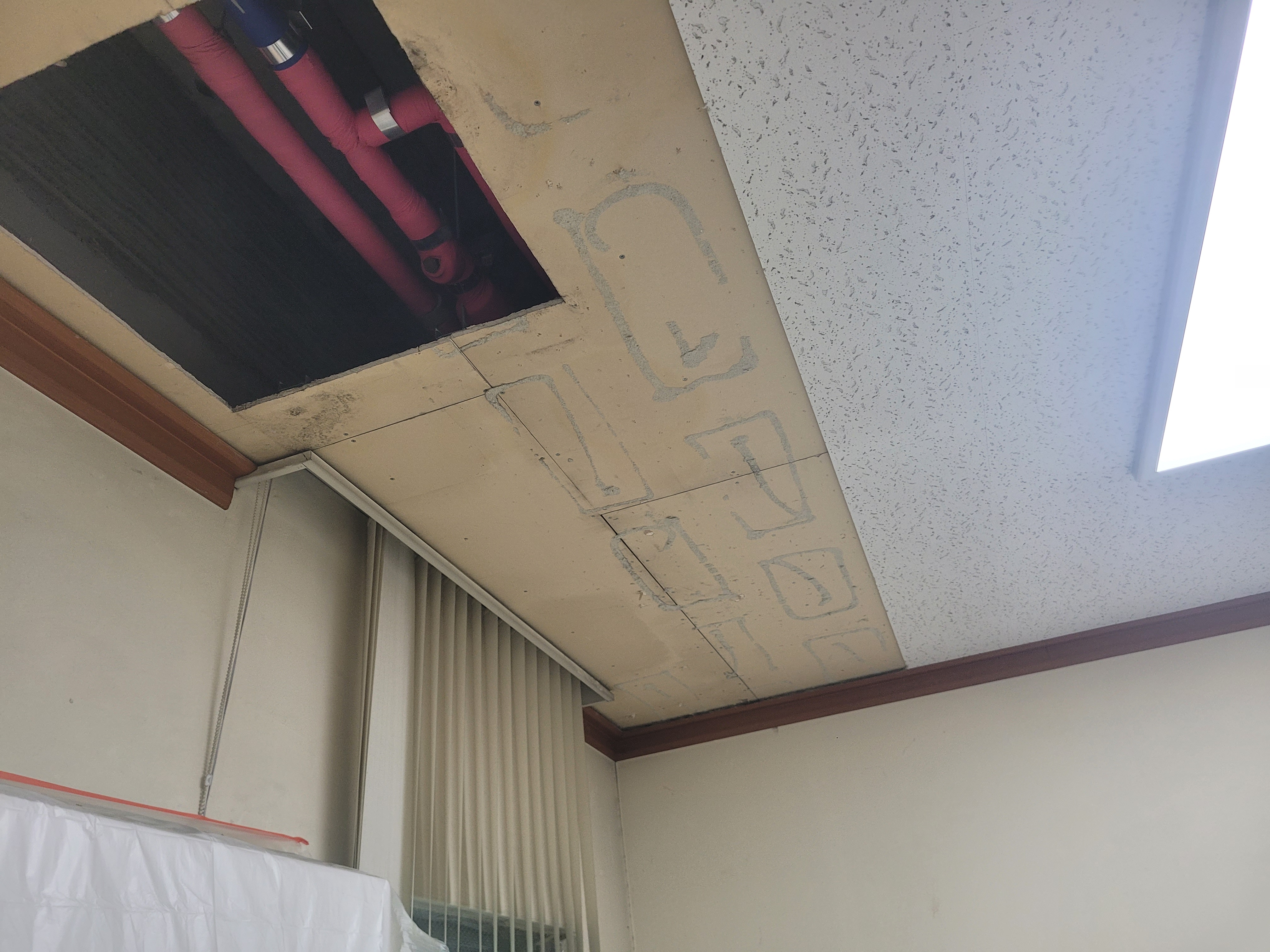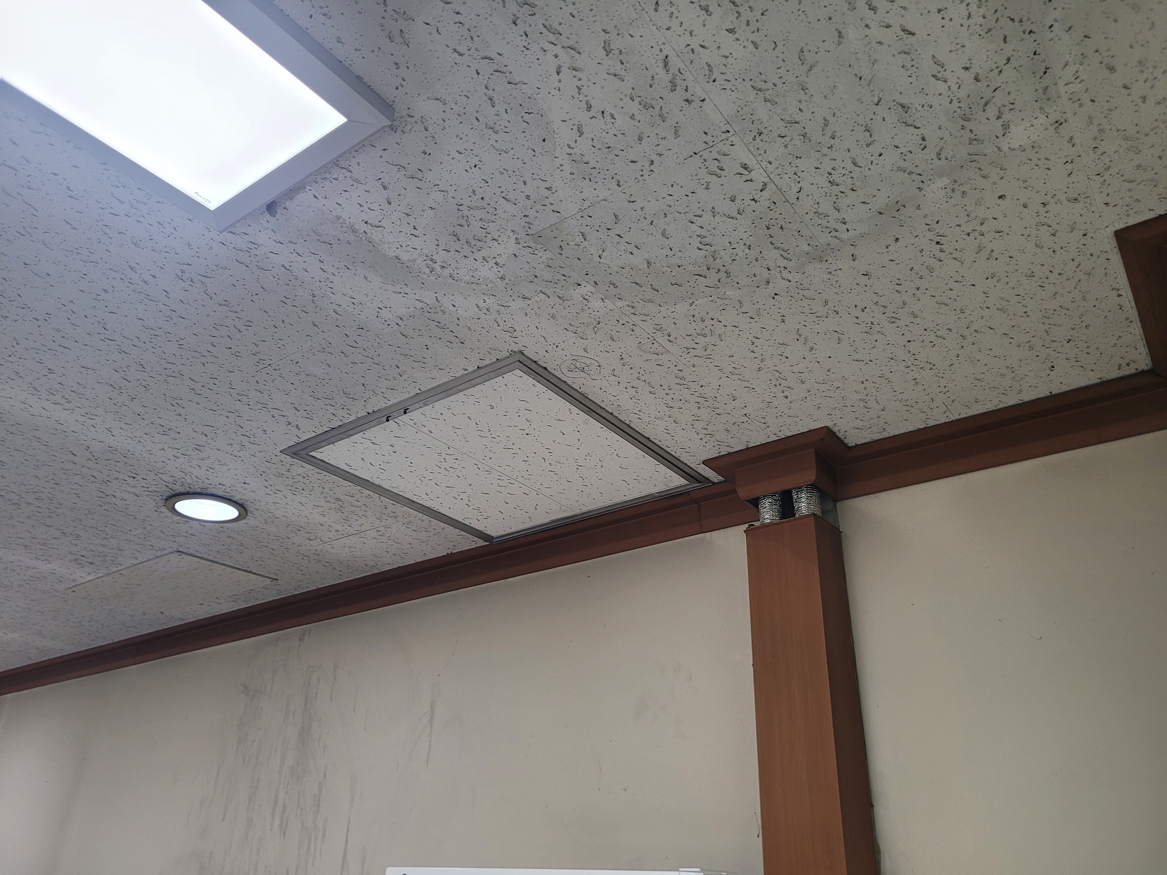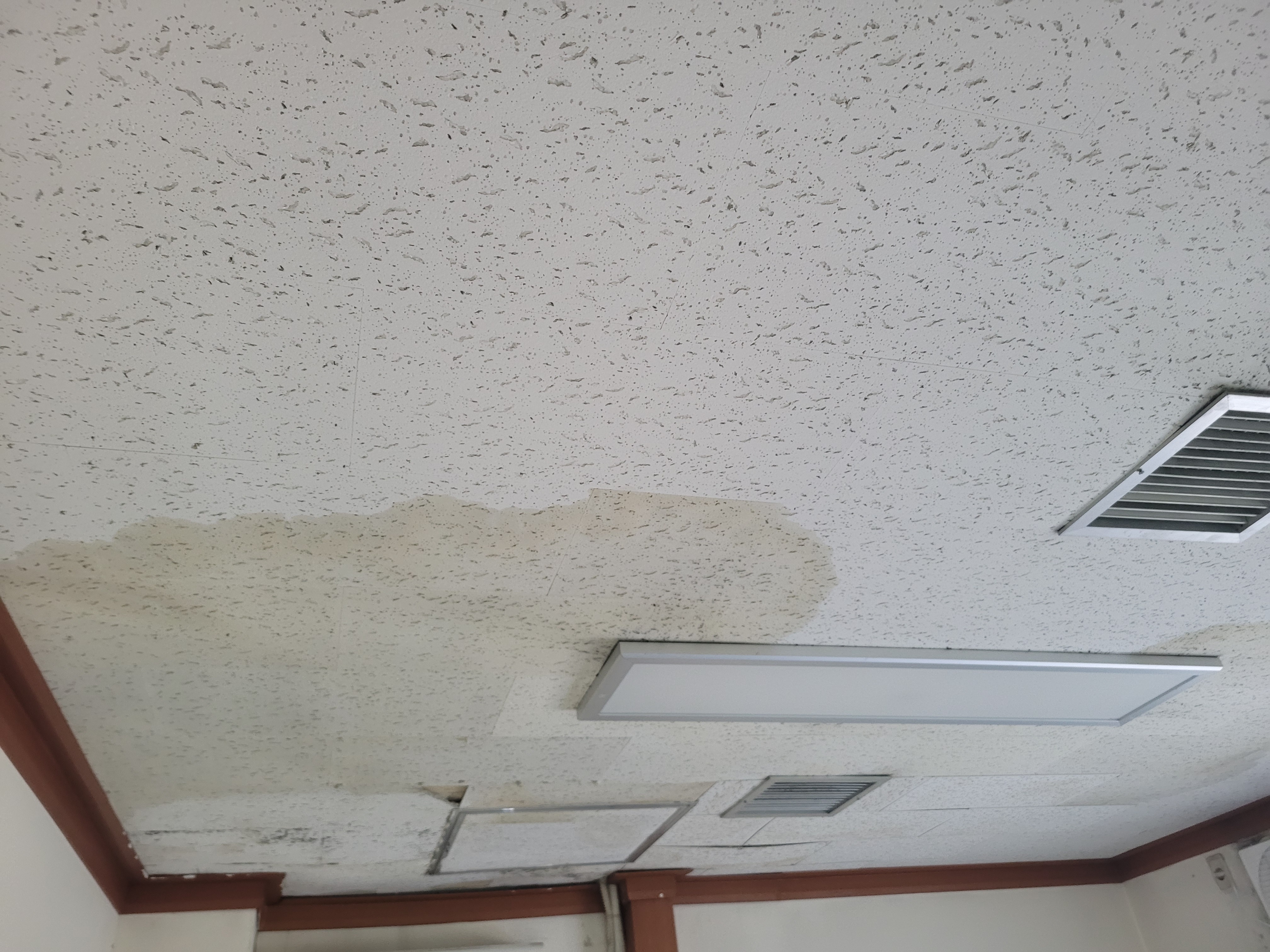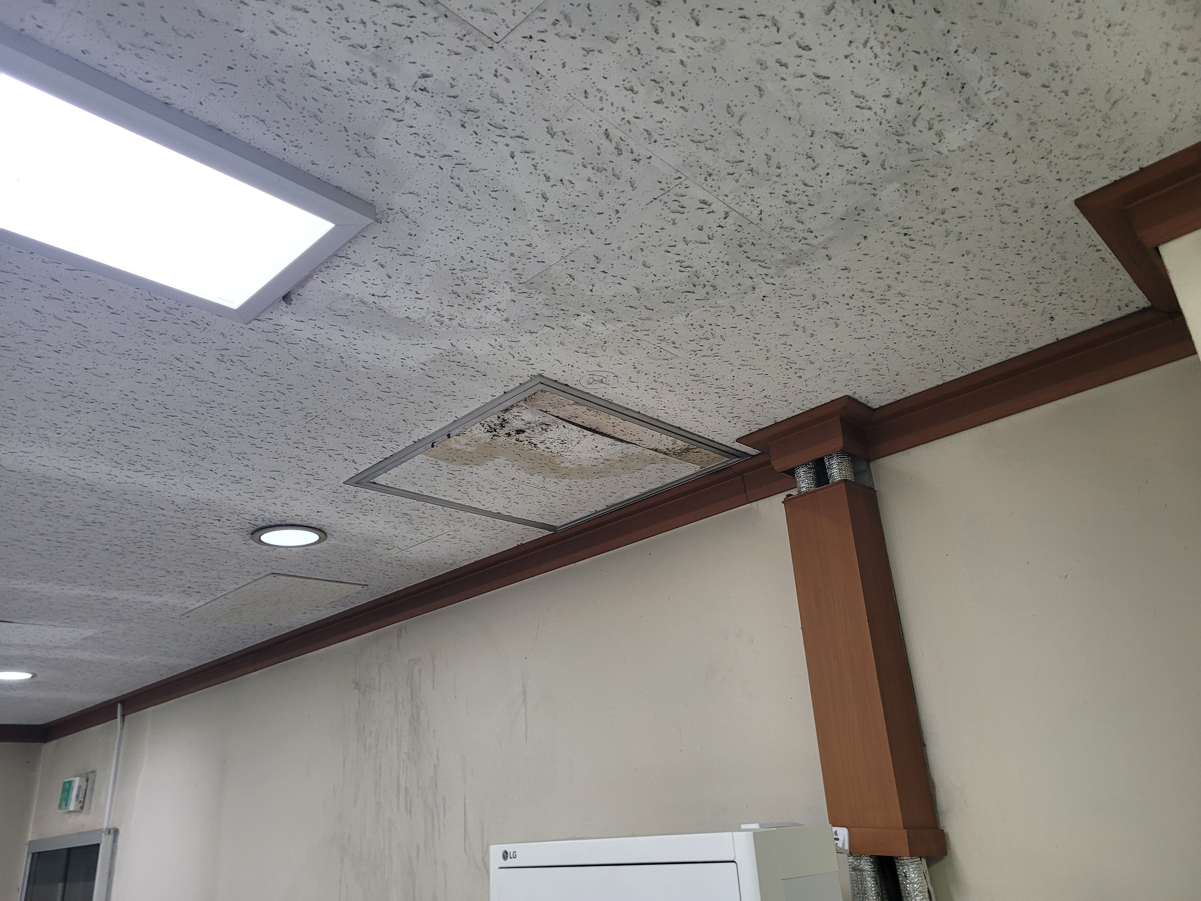작업 진행 방법: 얼룩지고 곰팡이 발생 된 마이톤, 석고보드 등을 철거 합니다. 기존에 사용된 몰딩도 철거 합니다. M-BAR가 이상 없는지 확인 후 필요하면 보강 작업 후 석고보드를 먼저 설치 합니다. 석고보드 마감이 완료되면 마이톤을 설치 합니다. 마이톤 설치 후 전등, 디퓨저, 감지기 등 다시 재자리에 설치를 진행 합니다. 마지막으로 기존에 설치 되어있던 몰딩으로 마감 합니다.