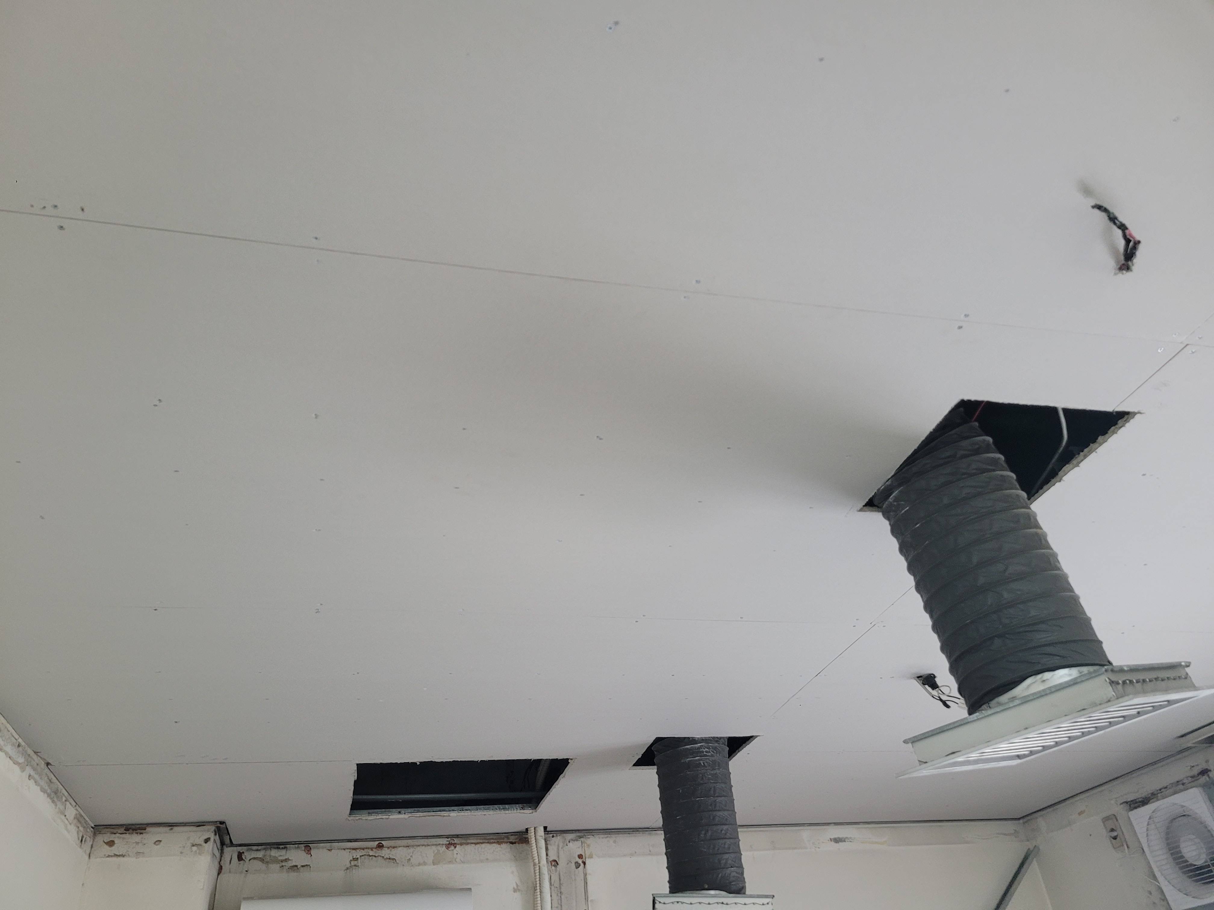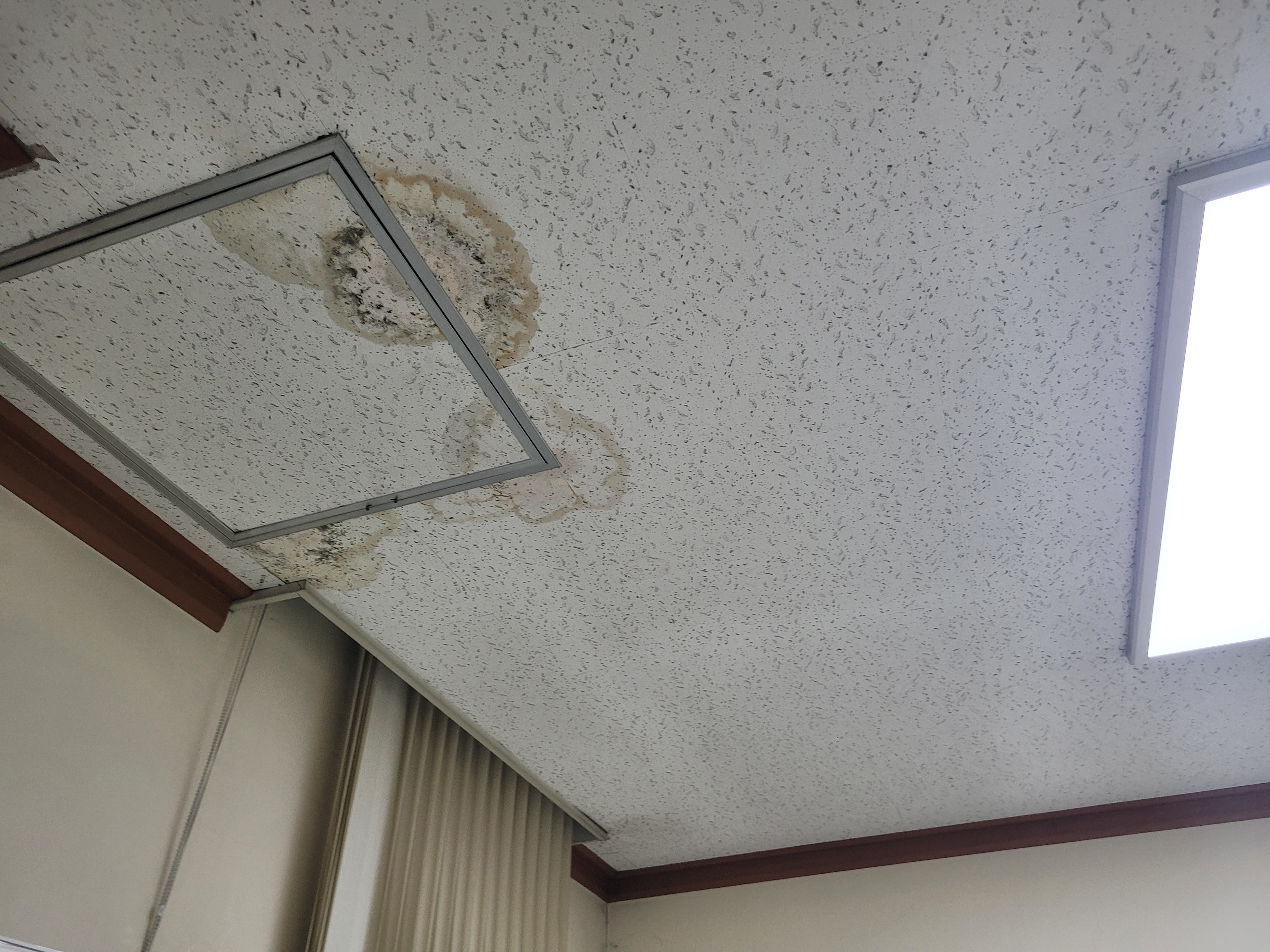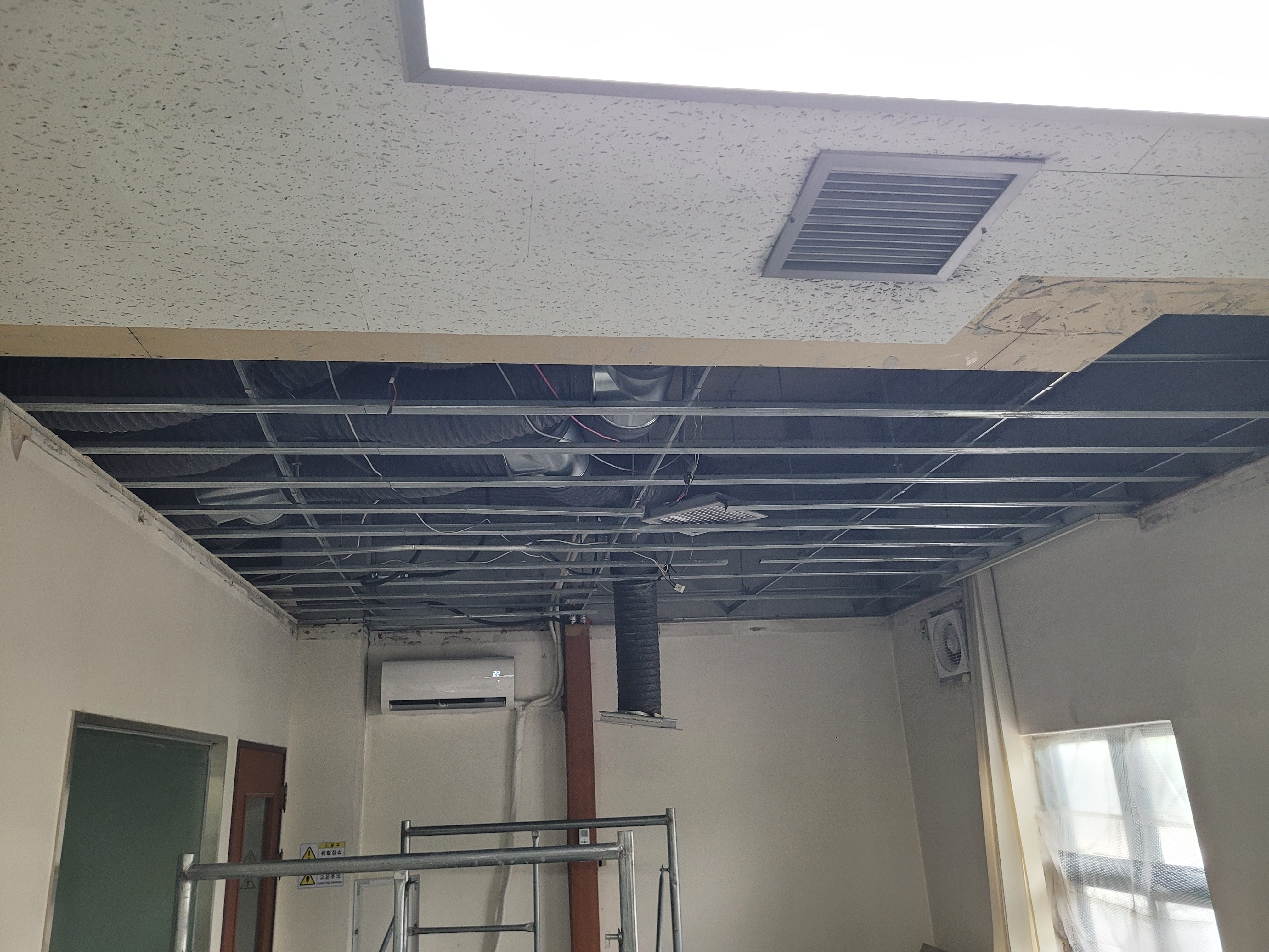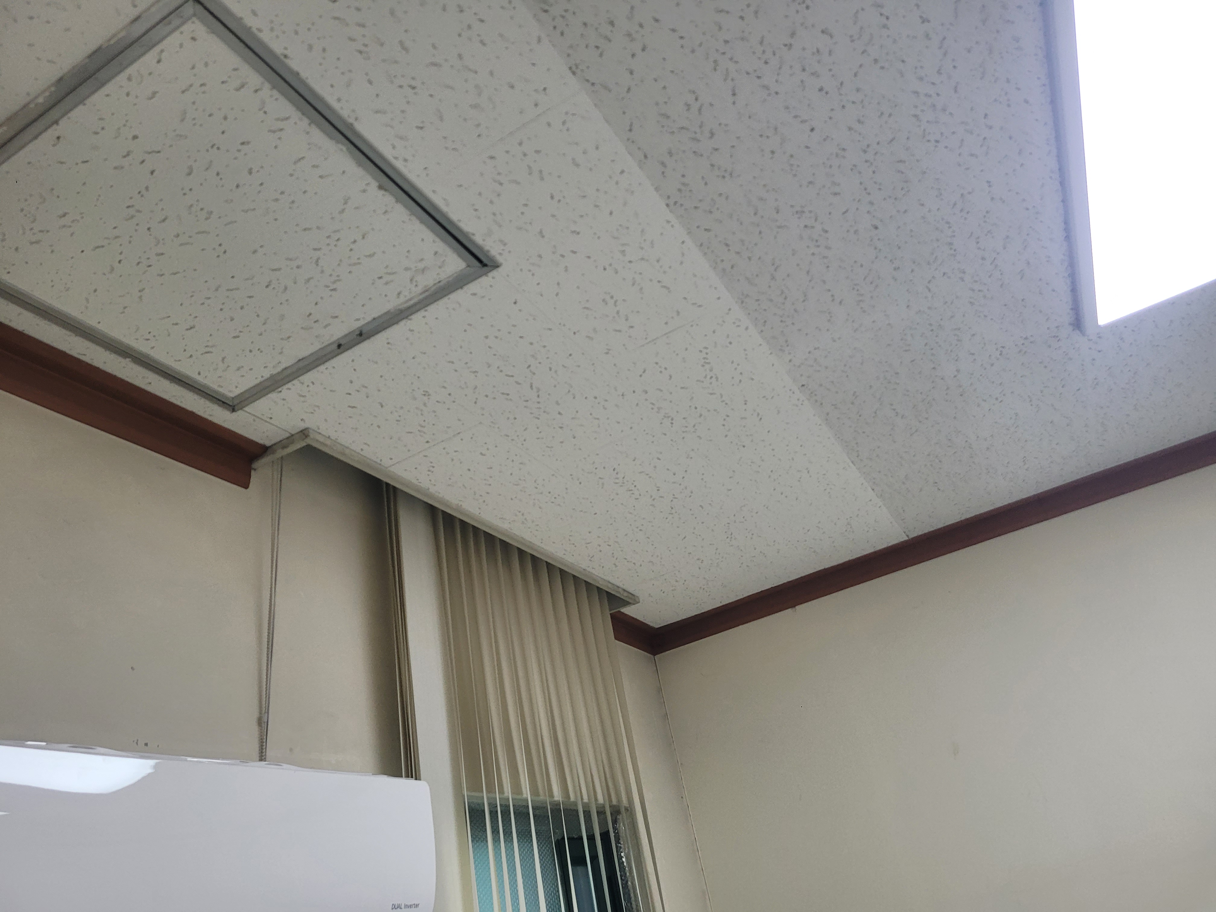 작업 진행 방법: 얼룩지고 곰팡이 발생 된 마이톤, 석고보드 등을 철거 합니다. 기존에 사용된 몰딩도 철거 합니다. M-BAR가 이상 없는지 확인 후 필요하면 보강 작업 후 석고보드를 먼저 설치 합니다. 석고보드 마감이 완료되면 마이톤을 설치 합니다. 마이톤 설치 후 전등, 디퓨저, 감지기 등 다시 재자리에 설치를 진행 합니다. 마지막으로 기존에 설치 되어있던 몰딩으로 마감 합니다.