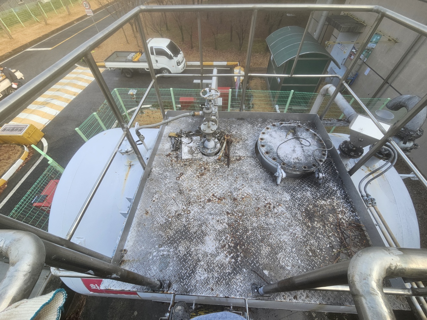 작업 진행 방법: 스텐 발끝막이판은 높이 10cm이상이여야 하며 다양한 재질이 존재하며 재질에 따라 설치 방법이 다를 수 있습니다. 이번 현장은 스텐 발끝막이판으로 스텐 난간대에 용접 작업을 통해 고정을 진행하였습니다. 용접 작업 후 스텐 스프레이를 통해 방청 작업을 진행 하였습니다. 곡면 구조와 기존 난간대 간섭을 고려해 농축조, 탱크 상부 구조에 맞는 맞춤 시공으로 진행 했습니다.