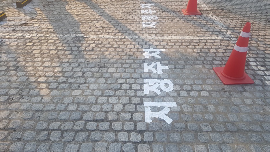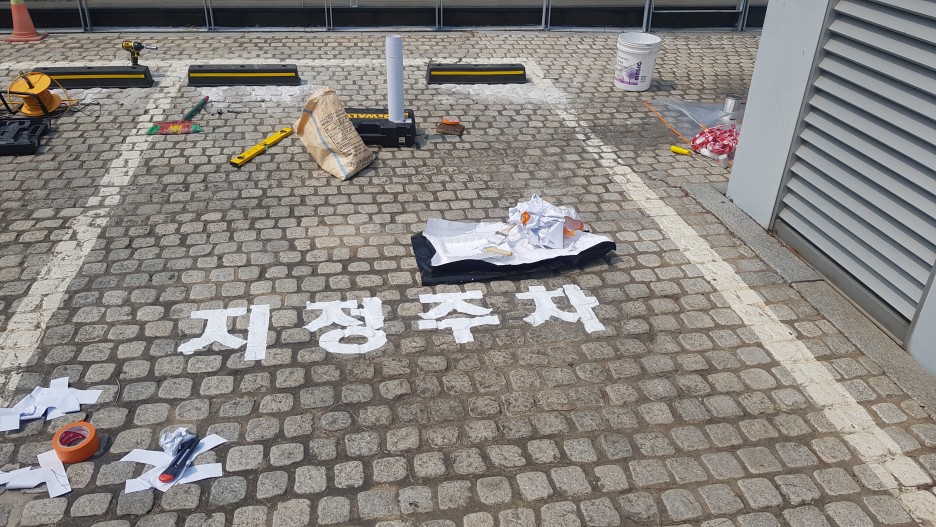 전면 주차 시트지를 제작한 후에 도로용 페인트를 사용해서 페인트칠을 해 주고